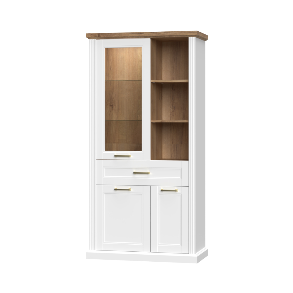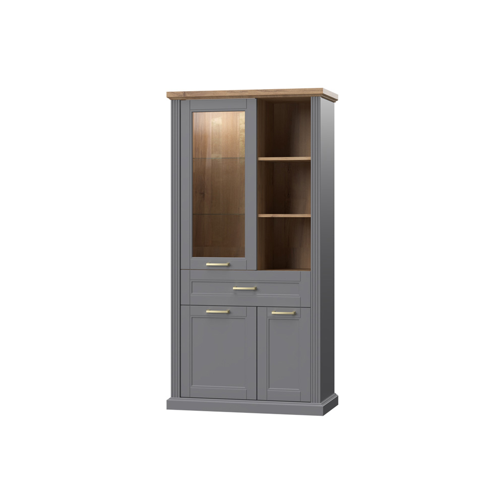 Висока витрина от колекция мебели ТАРА с една стъклена витрина, рафтове, чекмедже и две вратички.