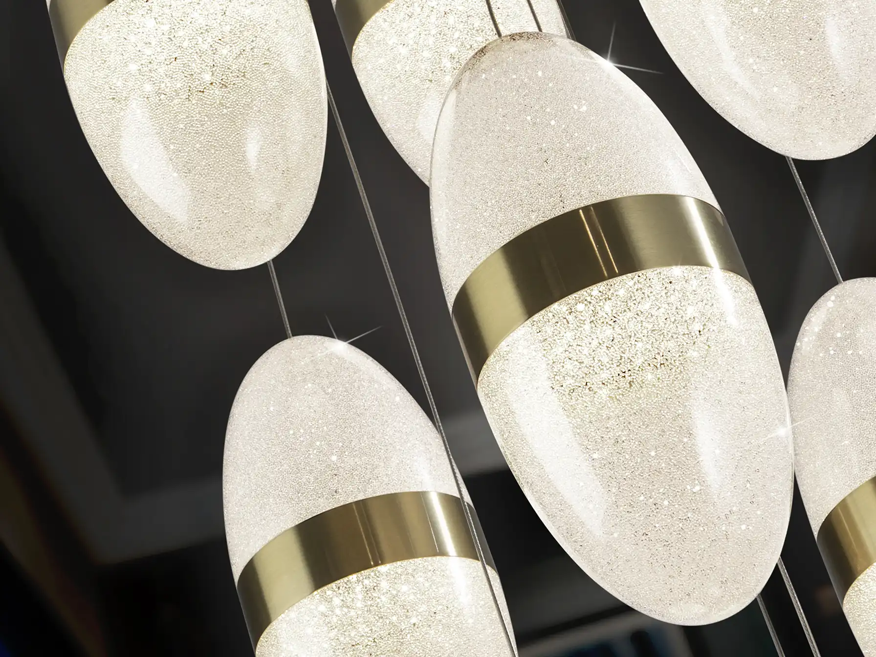 – **Дифузор:** Поликарбонатна сфера с диаметър 15 см и текстурирана вътрешна част, обрамчена с метален пръстен от месинг