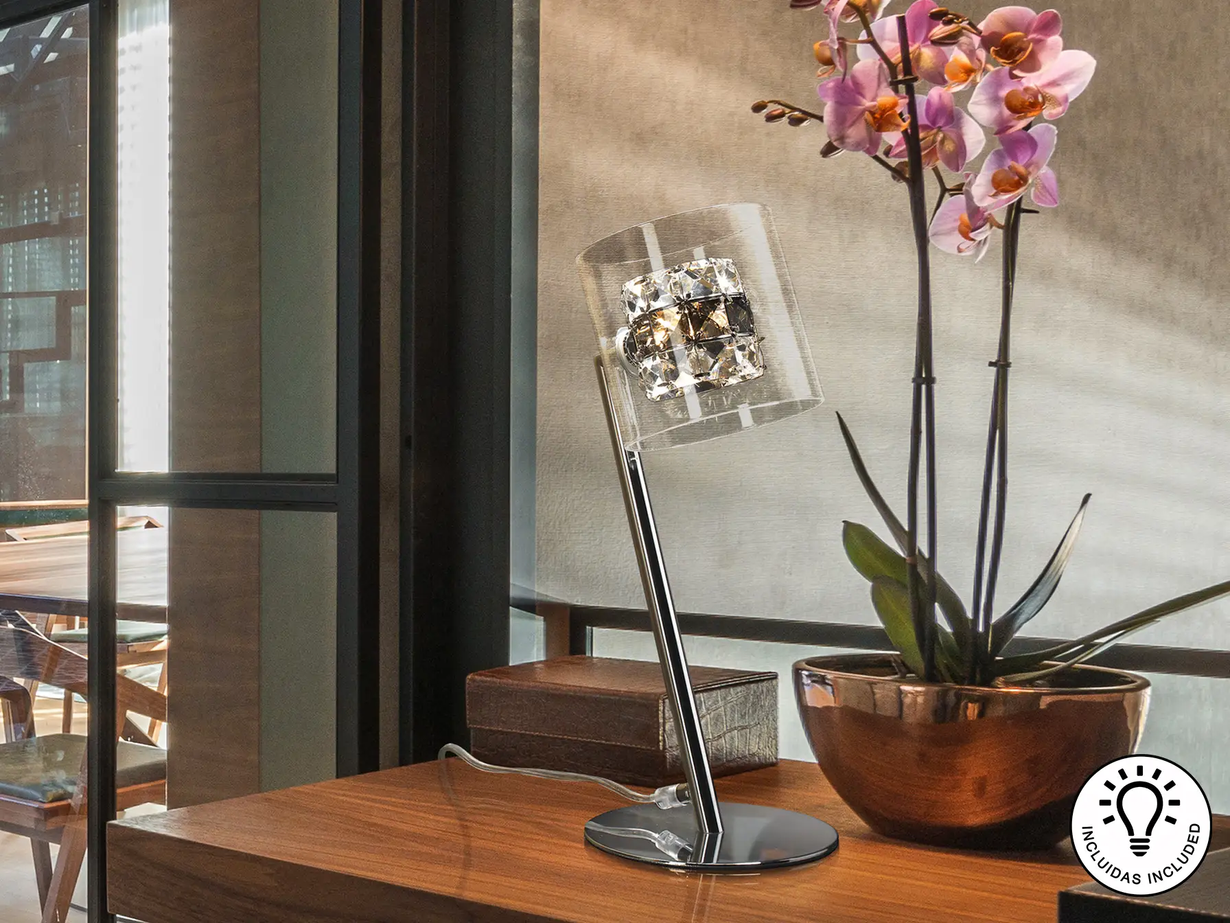 Лампата за маса FLASH е идеалният избор за добавяне на стил и уют във вашето пространство. Със своето изчистено хромирано покритие и двоен абажур, тя съчетава естетика и практичност.