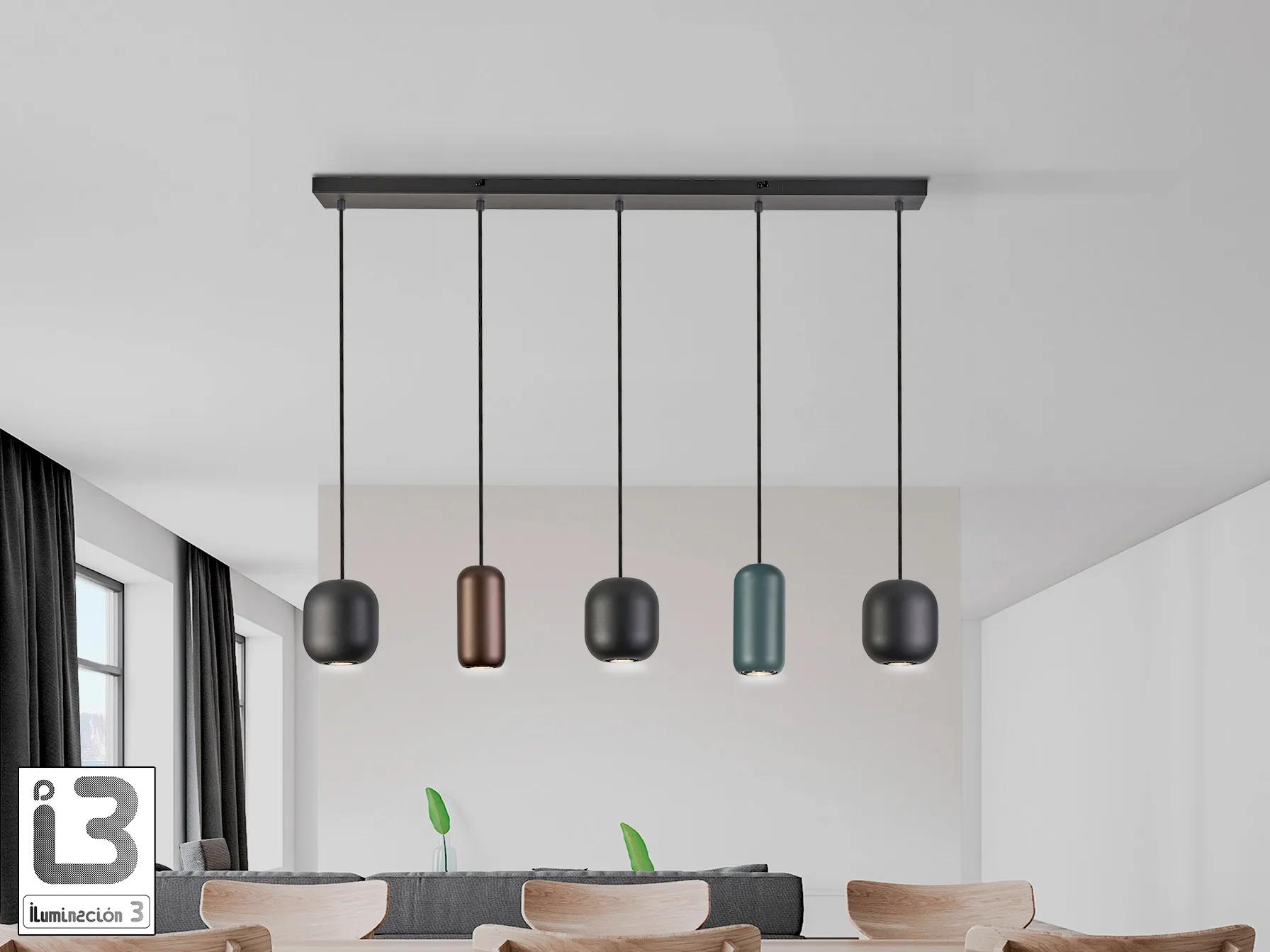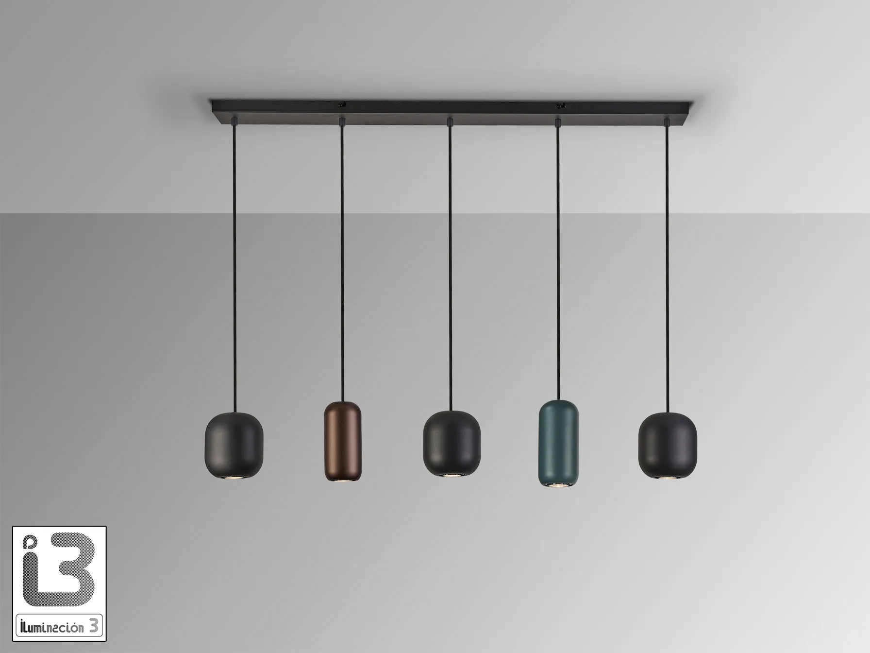 Лампата I3 – NIMES е изработена от метал с матово черно покритие, което придава модерен вид и стил. С 5 метални абажура в различни цветове, включително матово черно, тъмен кафяв и тъмен зелен, тя е идеален акцент за вашия интериор.