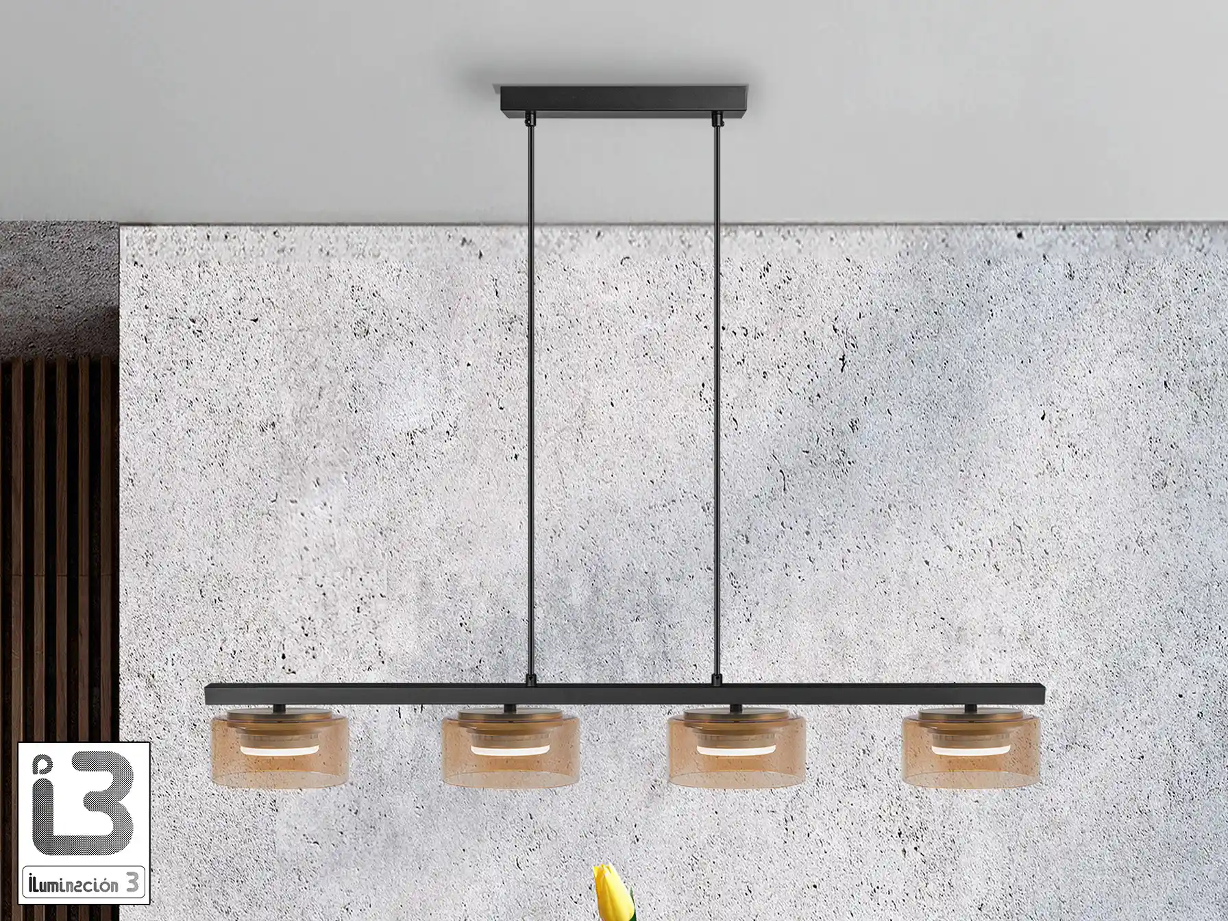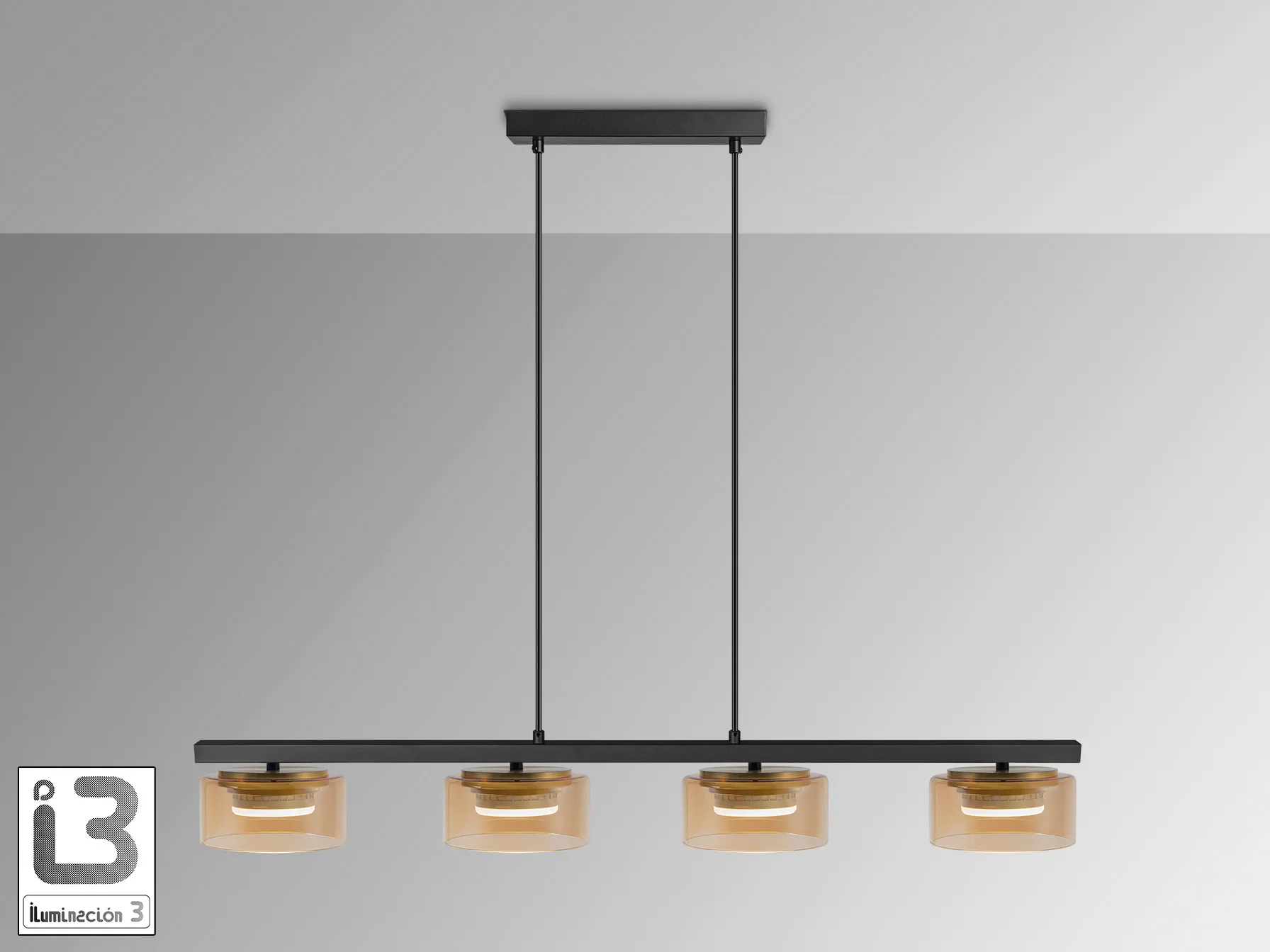 Лампата предлага възможност за регулиране на височината, което я прави изключително удобна за различни пространства. С четирите си абажура от кехлибарено стъкло, тя не само осветява, но и добавя стилен акцент към всяка стая.