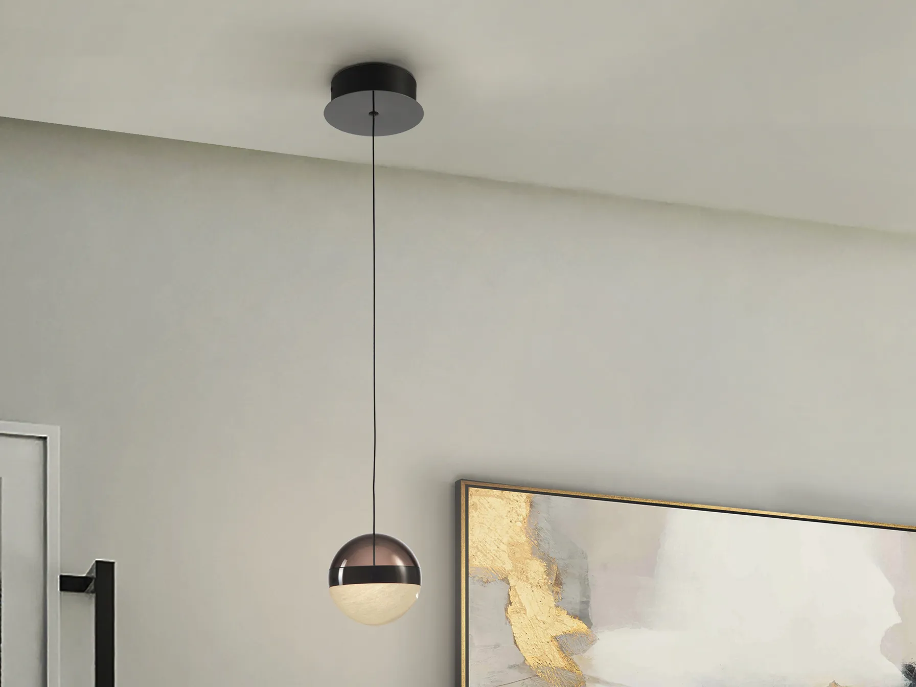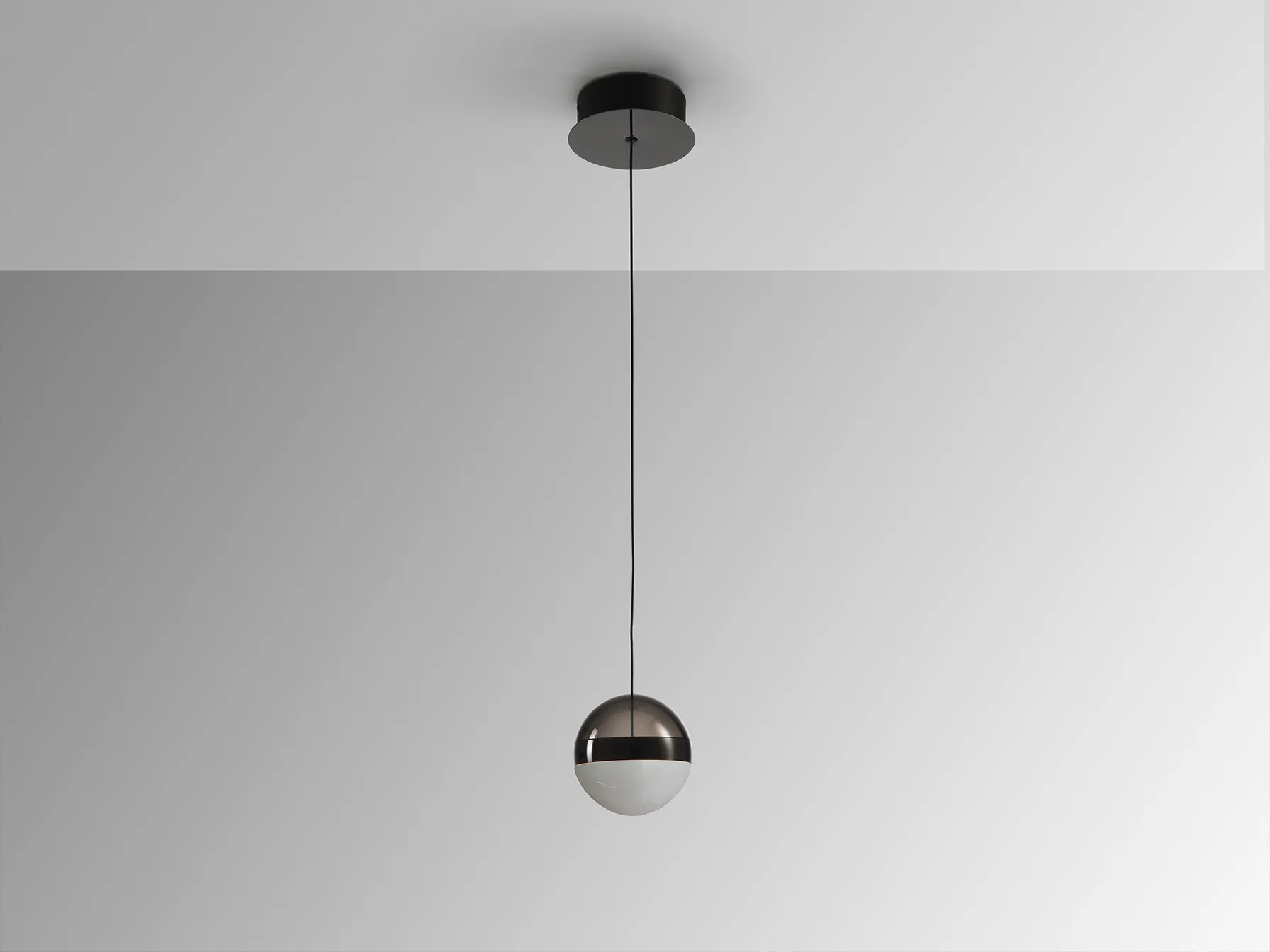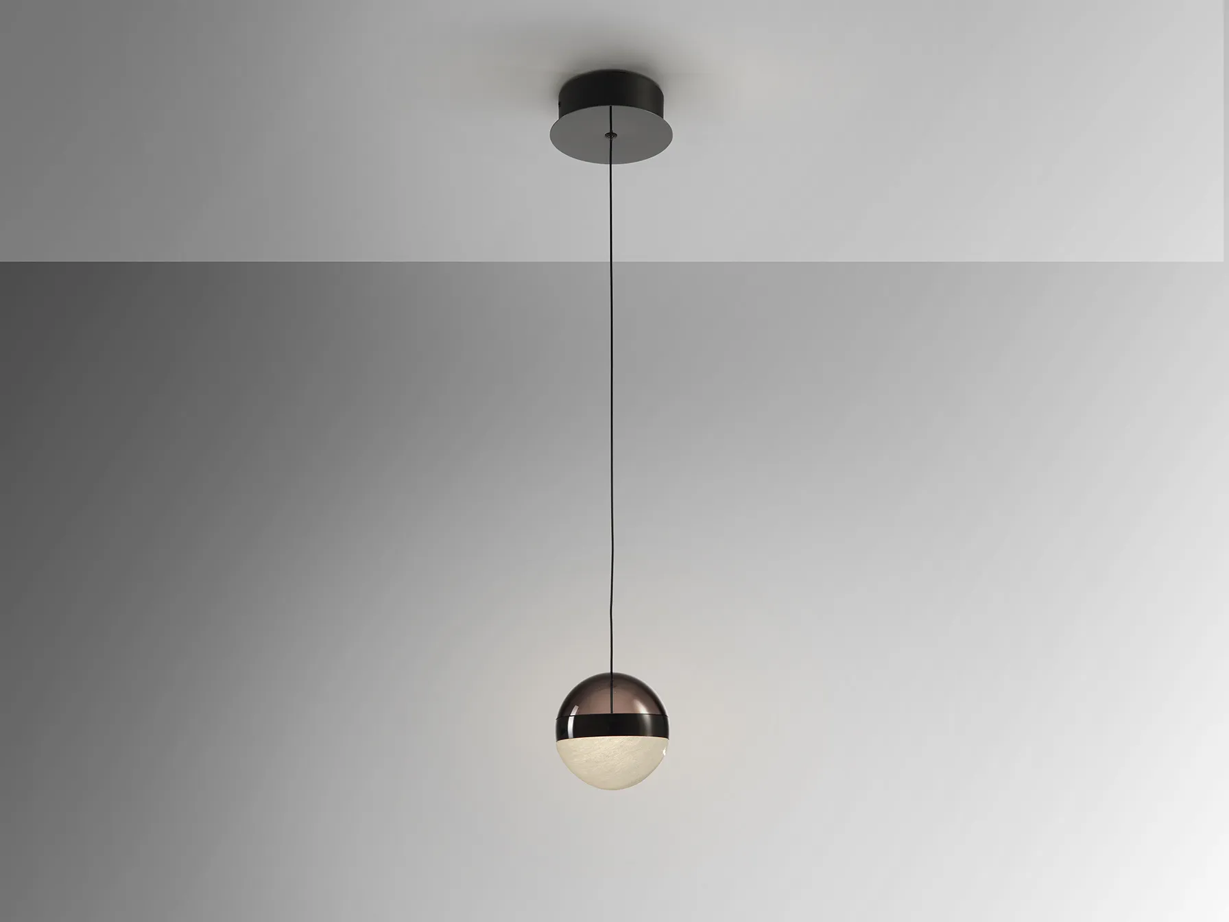 – **Дизайн**: Абажур с диаметър 12 см, изработен от димящ поликарбонат и мраморен стъклен елемент, завършен с метален ринг в черен хром.