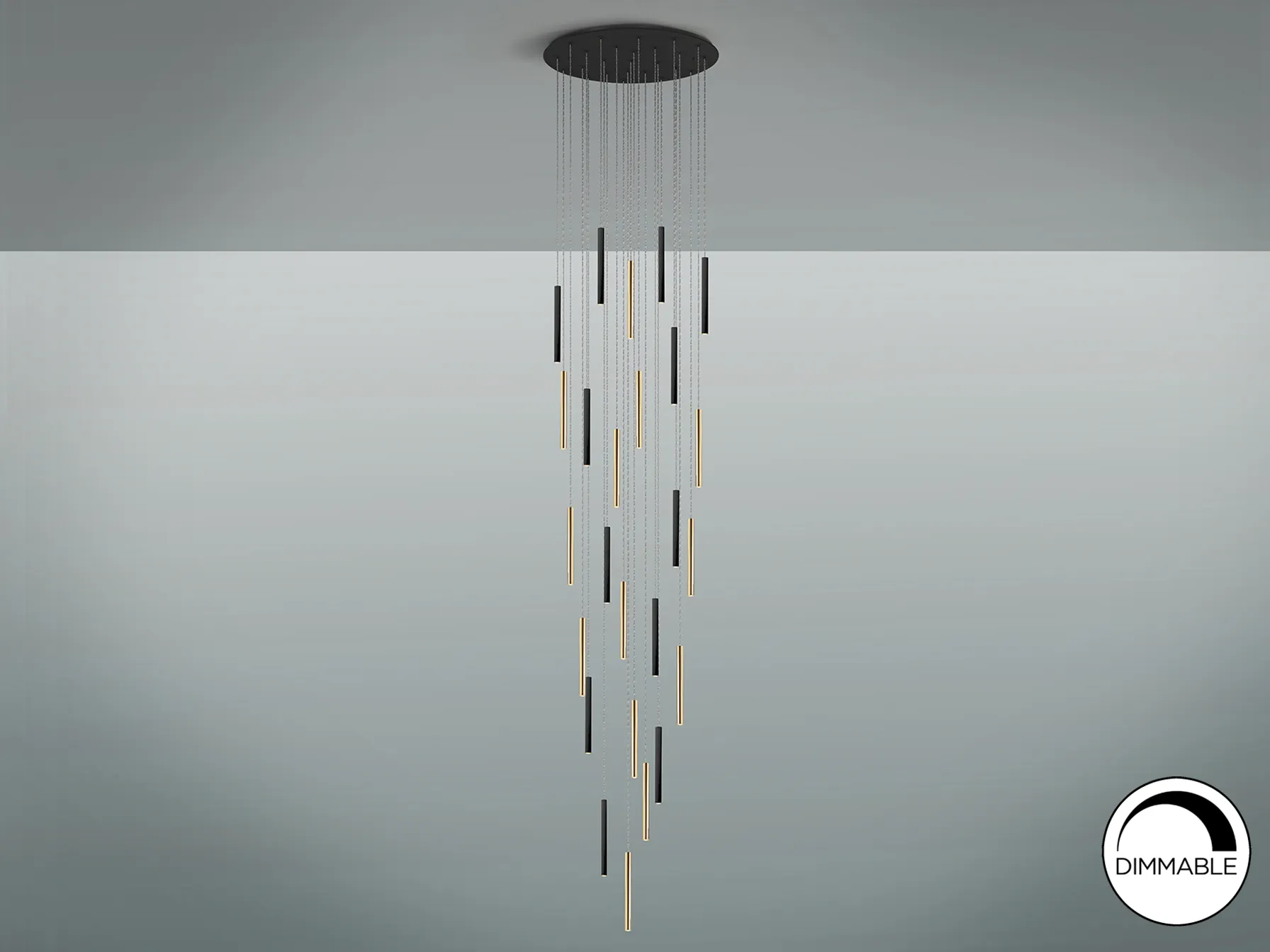 Лампата е изработена от метал и е завършена в стилно златно и матово черно, което я прави перфектно допълнение за всяко модерно пространство. Опалният акрилен дифузер осигурява равномерно разпределение на светлината, а възможността за регулиране на яркостта я прави още по-гъвкава за вашите нужди.