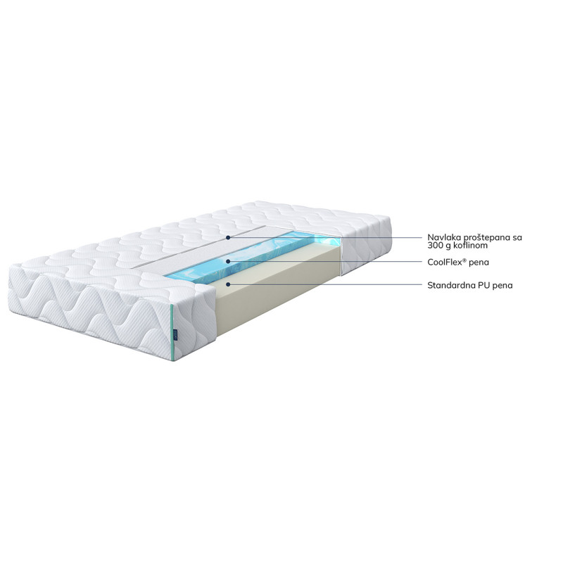CoolFlex® пяната е изключително издръжлива и адаптивна, нейната клетъчна структура позволява висока еластичност и оптимално ниво на поддръжка, така че матраците, изработени от тази пяна, могат да бъдат класифицирани като матраци с подчертани ергономични ортопедични свойства. Тази пяна разпределя натиска върху цялата подложка, така че помага да се предотврати прехвърлянето на движение към човека, до когото спите. Благодарение на отличната си проветривост, позволява повишена циркулация на въздух и влага и се връща в първоначалната си форма веднага след компресия.