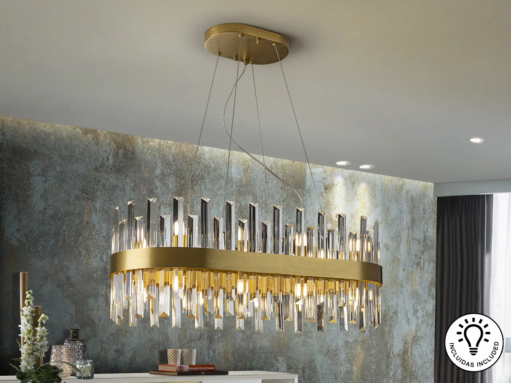 Лампата е изработена от висококачествени материали, а златистото покритие придава луксозен вид. Прозрачните стъклени пръчки не само че разпръскват светлината, но и добавят дълбочина и характер на интериора. Подходяща е за различни помещения, включително дневни, спални и офиси.