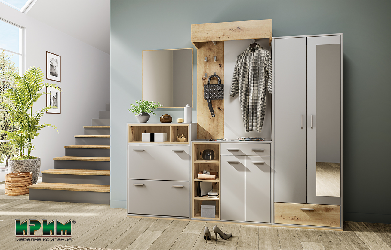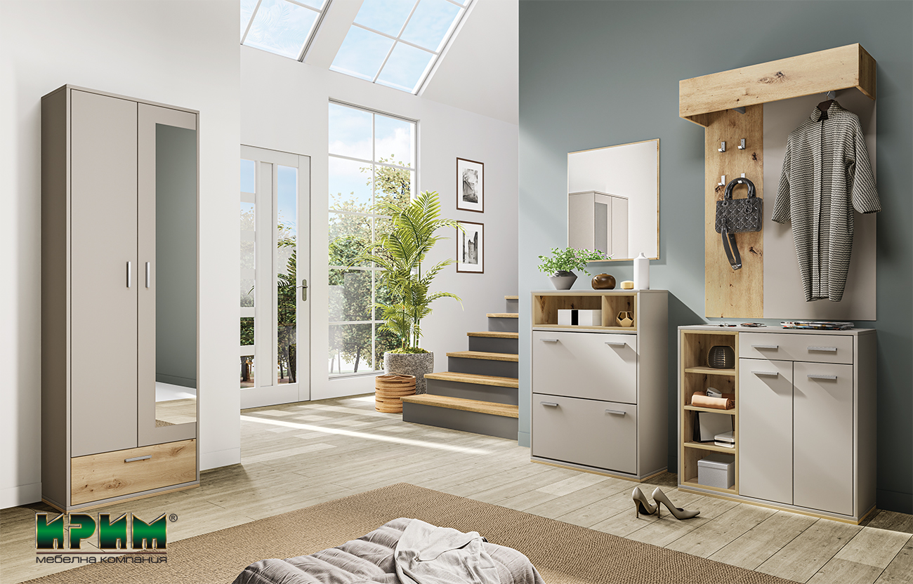Нова модулна система с модерна визия и изчистено излъчване в дъб артисан и сатен. Всички модули се предлагат отделно, което я прави изключително удобна. Всички отваряеми врати са снабдени с плавно затваряне. Предложен е избор между два шкафа за обувки, един с механизъм, а друг на рафтове. Тази комбинация е много актуална в съвременния интериорен дизайн.