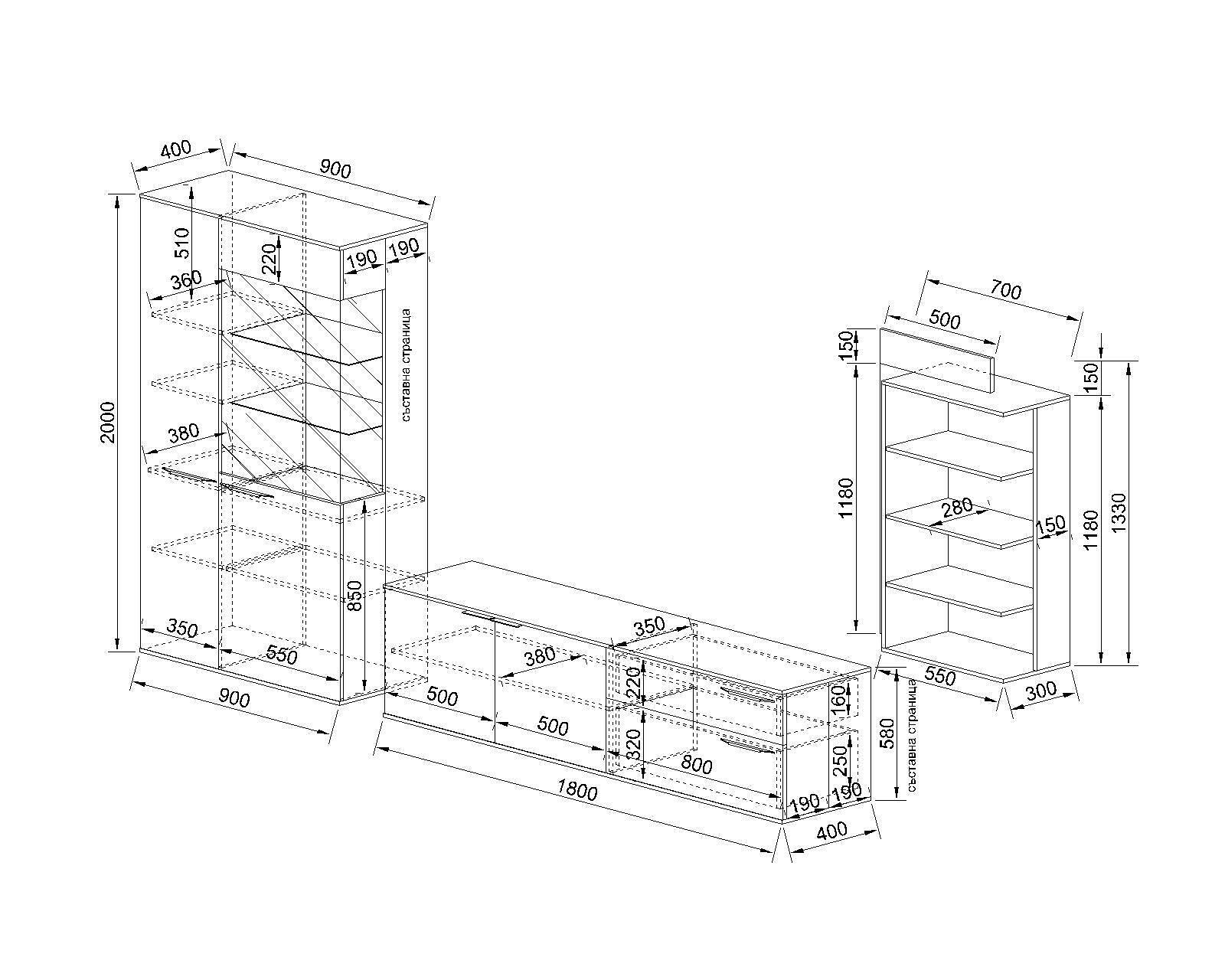 Комплекът включва: Секция, тв шкаф и етажерка