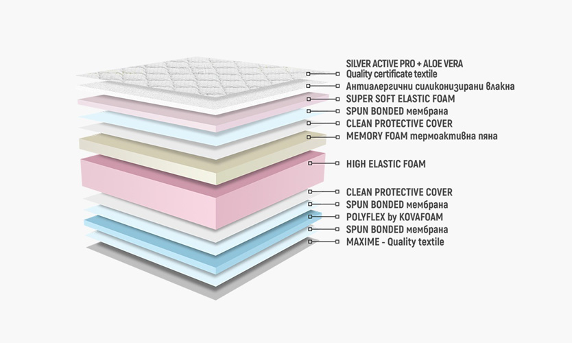 HIGH ELASTIC FOAM с висока плътност в сърцевината подсигурява перфектна точково – еластична опора на тялото. За оптимално напасване и равномерно разпределение на тежестта към матрака се грижи обемният слой от термоактивна MEMORY FOAM. Красив капитониран калъф завършва модела. Делимия цип улеснява поддържането на перфектна чистота. Сребърните нишки, втъкани в текстила SILVER ACTIVE PRO, отделят сребърни йони, а капсулите ALOE VERA придават SPA ефект. Модел със златен медал за комфорт + НАНИ иновации от 21 век.
