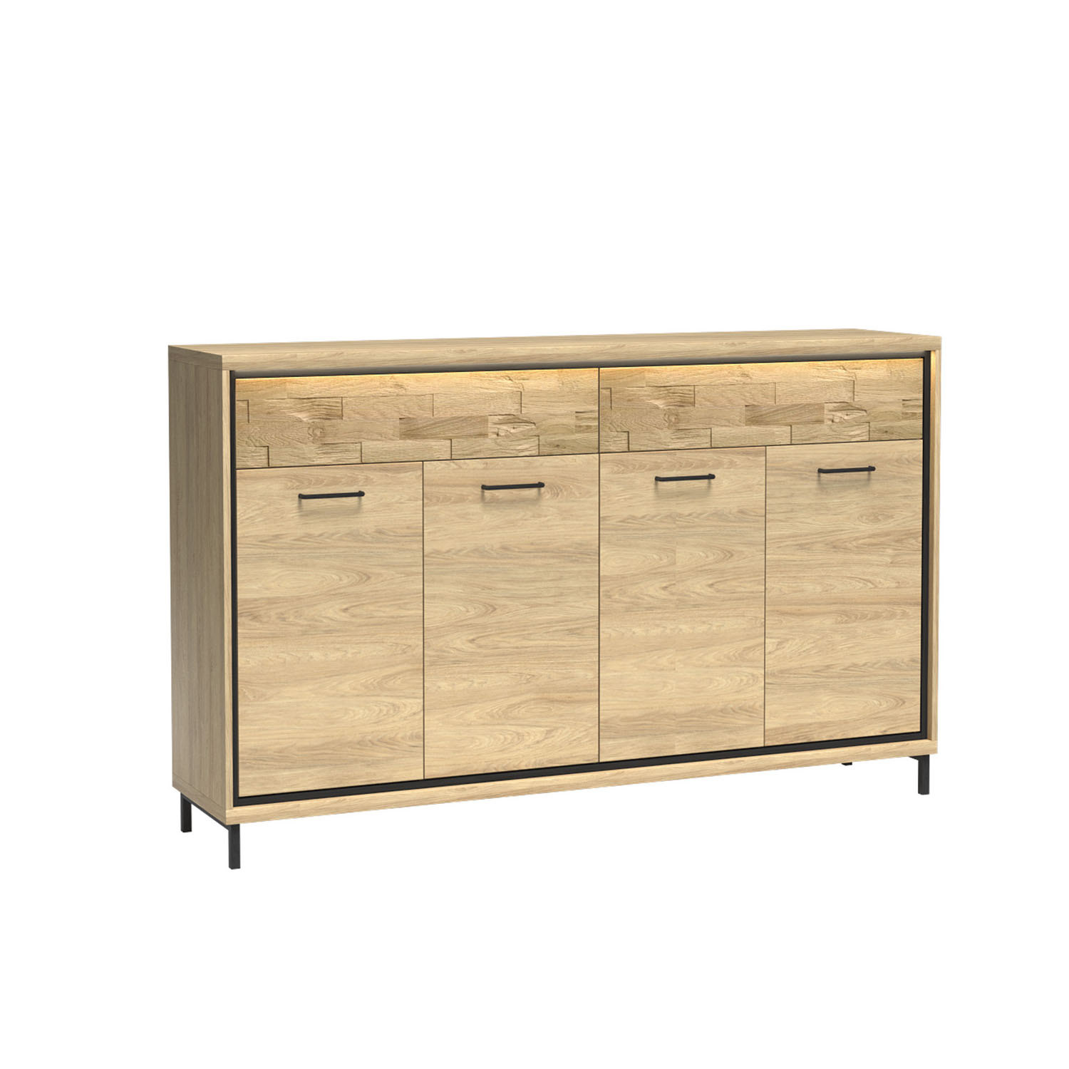 Голям скрин с ширина 177см. Долната част се състои от два шкафа с двукрили врати. Във всяка от тях има рафт за съхранение. Артикулът е с две отваряеми с допир чекмеджета, които се плъзгат по водачите. Пантите, използвани във вратите, са с най-високо качество, безшумно затваряне, масивни, метални панти. Черни дръжки и декоративна лайсна около мебелите създават интересна комбинация със светлата мебелна плоскост. Цветът е най-близък до естествения цвят на дървото. Той се вписва в спалнята, хола или младежката стая със своя  универсален, модерен, индустриален стил. Можем да го използваме и като бюфет в трапезарията, за да държим чинии, красива ваза или коледна украса.