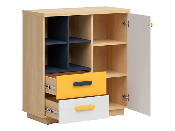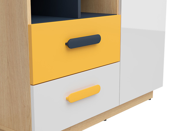 Предимството на мебелите от модулната система Wesker са нейните цветове. Огледално бели и жълти фронтове са комбинирани с корпус от полски дъб и тъмносини рафтове. За контраст са избрани овалните, тъмносини и жълти дръжки, които подчертават свободния, младежки стил. Комфортното използване на мебелите се дължи на водачите и пантите с безшумна система за затваряне.