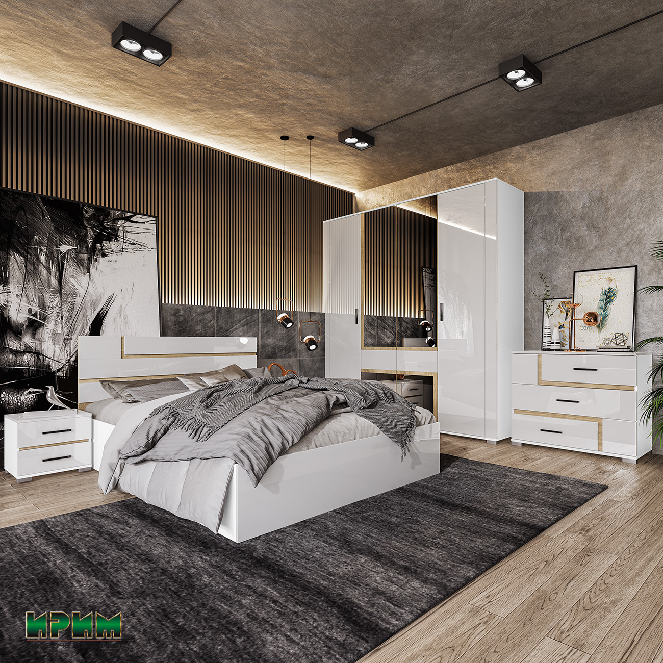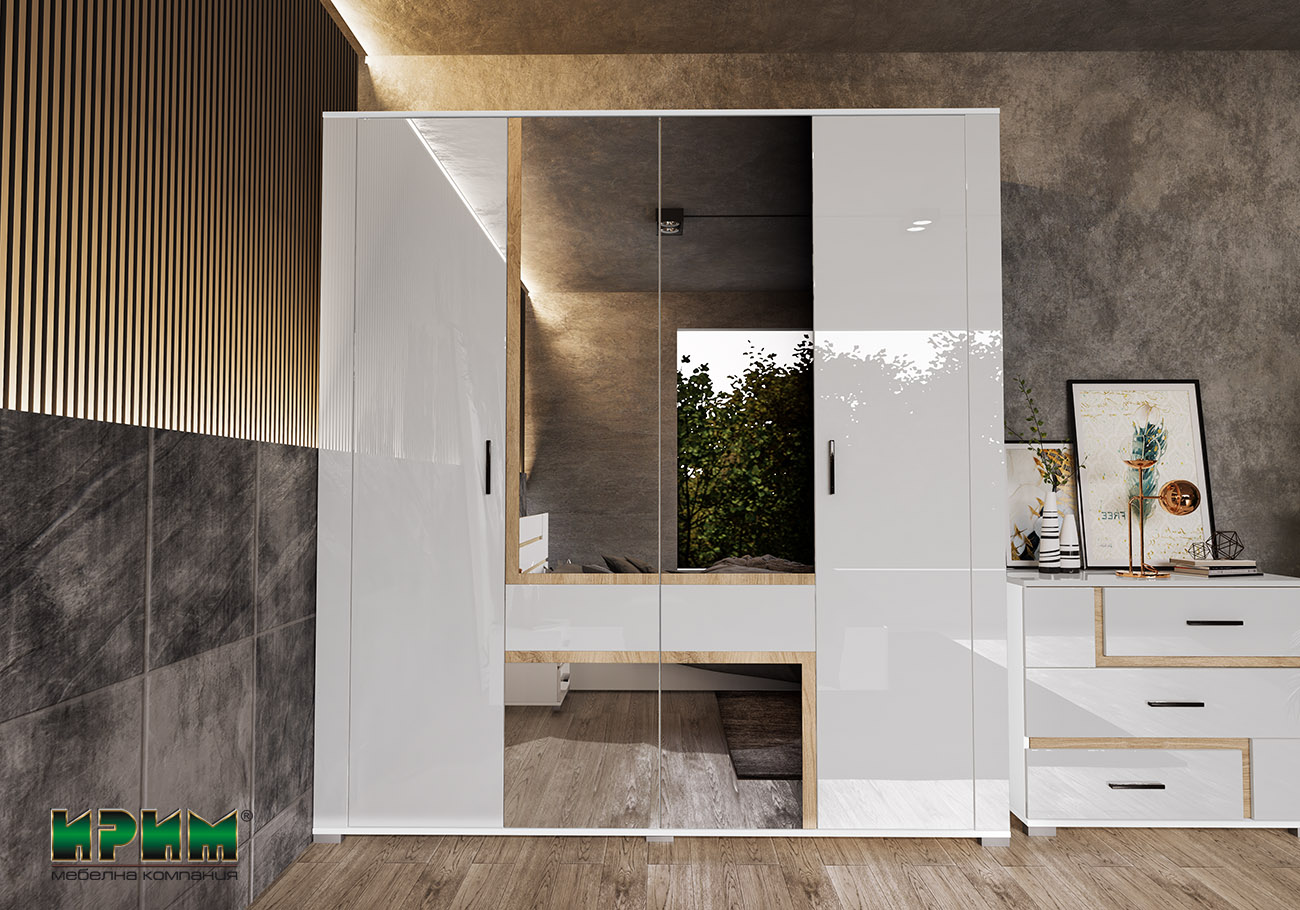 Моделът е предназначен за любителите на бялото. Добавена е деликатна нотка от дървесен декор сонома арвен. Леглото е снабдено с повдигащ механизъм, а гардеробът с 4 крила и 4 огледала. Скринът има 3 чекмеджета и е включен в цената на модела.
