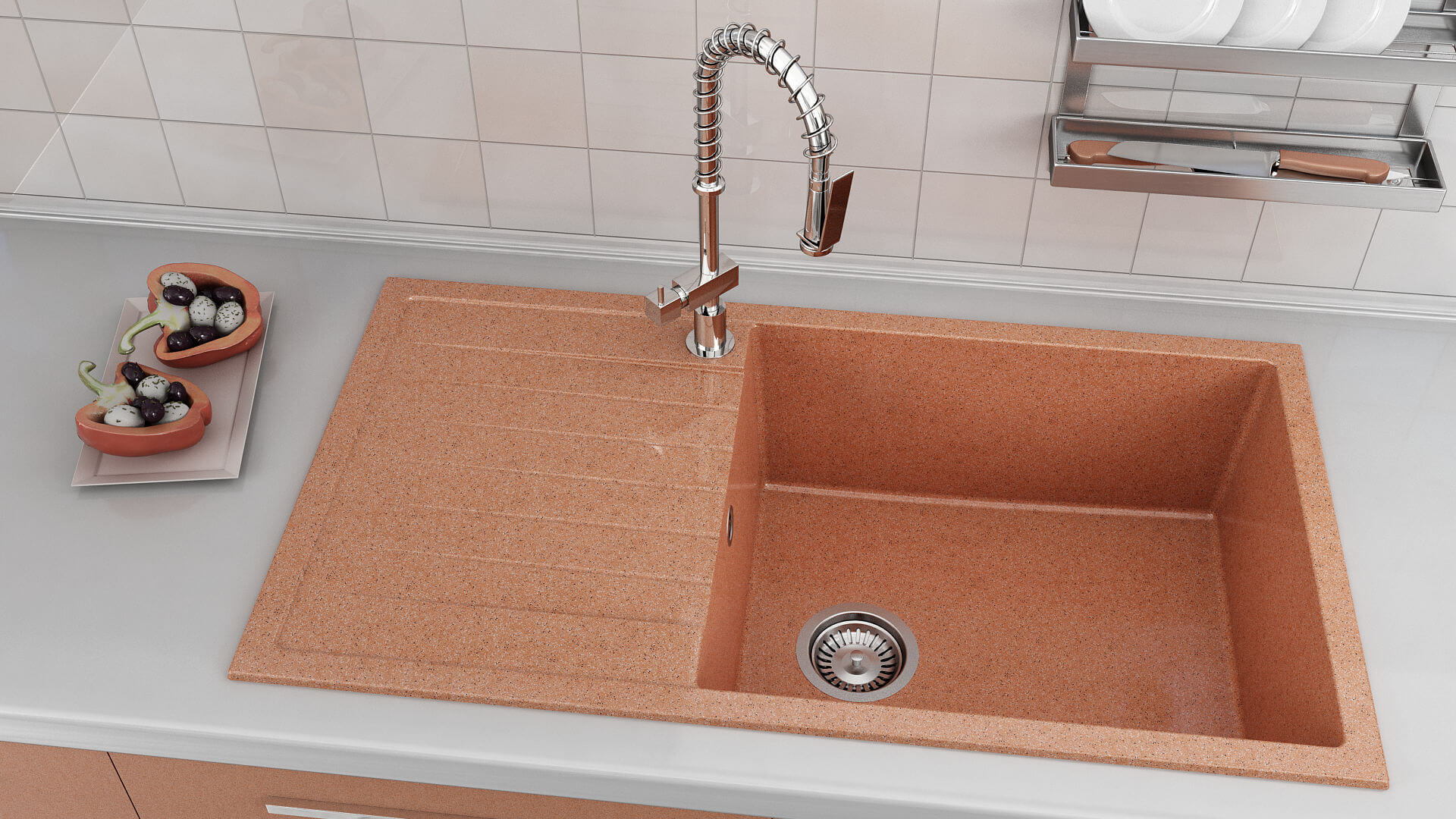 • Окомплектовка с висококачествен сифон с преливник и индивидуален шаблон за улесняване изрязването на отвора върху кухненския плот за вграждане на мивката.