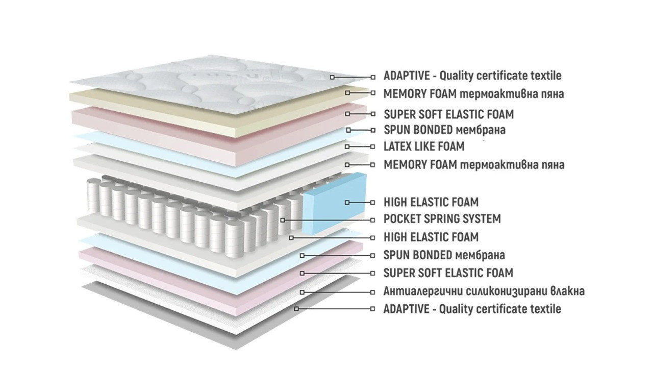 - Слой мемори пяна, адаптираща се по тялото