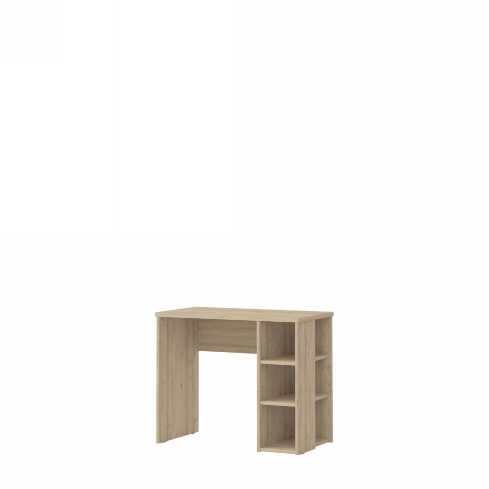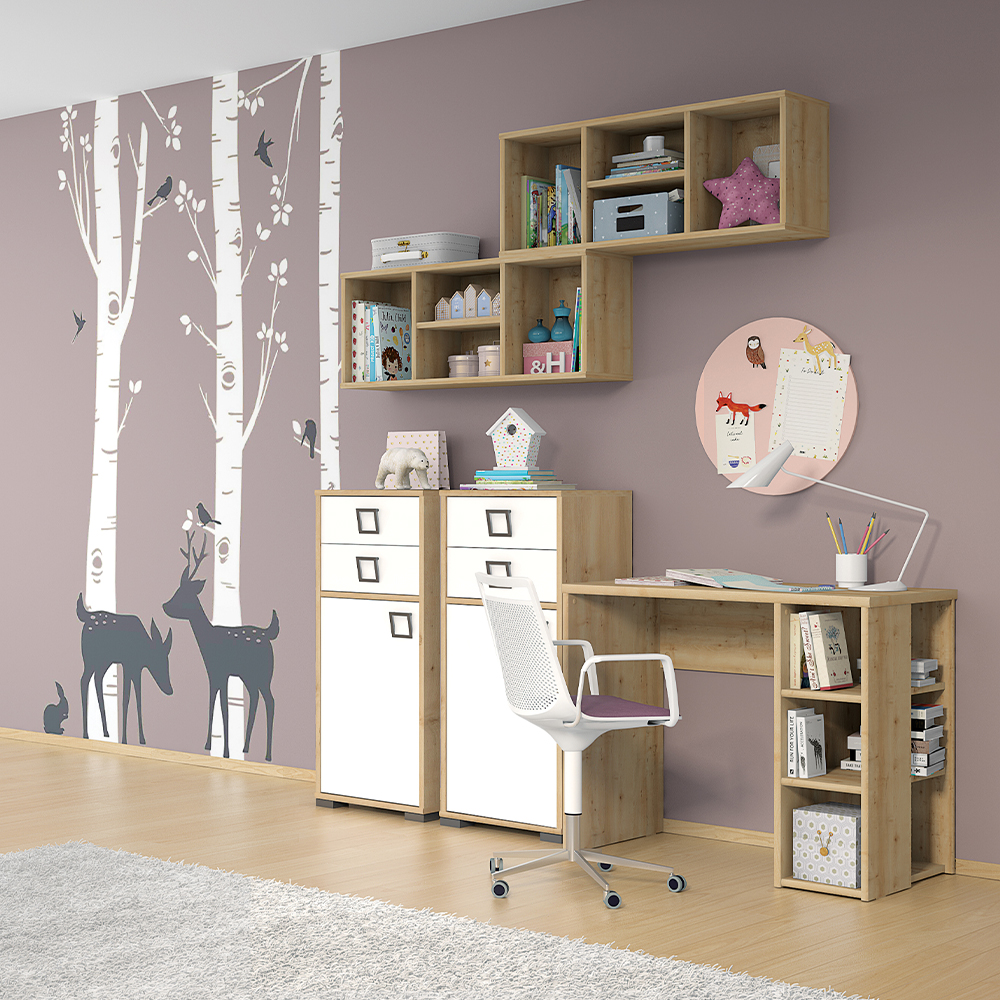 Работно бюро, което се вписва във всяко пространство с размерите си. Рафтовете и работният плот са изработени от ПДЧ с дебелина 25 мм, а останалата част от корпуса е с дебелина 18 мм. Предлага се в бял цвят или дървесен декор Бук по избор на купувача. Корпусният елемент има кант от задната страна. Заоблените ръбове, завършени с 3 мм ABS кант от екологични материали, ще допринесат за безопасността на вашите деца. Пълният мебелен обков и инструкциите за монтаж ще направят сглобяването на този елемент много лесно.