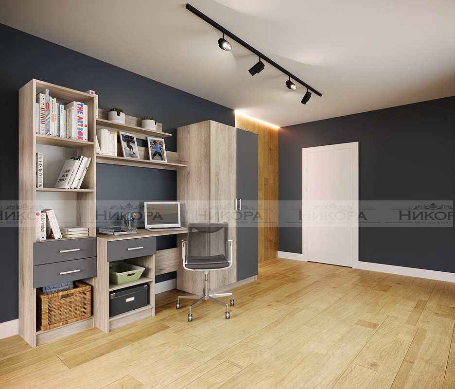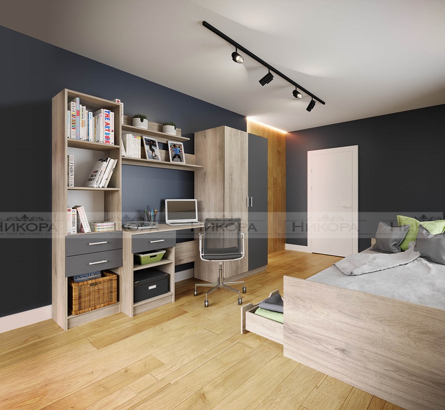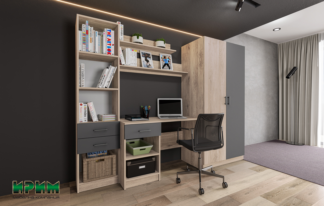 Детското обзавеждане включва секция с гардероб ( шкаф с две чекмеджета и механизъм за плавно затваряне), бюро и етажерка – City 5030 и легло за еднолицев матрак 900/2000мм, с възможност за двулицев матрак – City 2029.