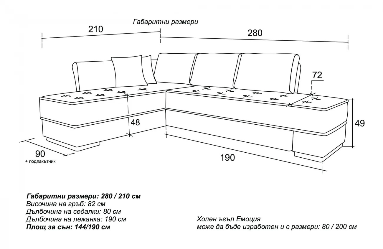 “Емоция” е функционален ъглов диван, който с еднаквите си по размер седалки се определя и може да бъде използван като ъглово легло. Разполага с ракла за багаж, а въртящият механизъм я превръща в спалня за секунди. Седалките са съставени от тапицирани матраци тип „Бонел” или “Покет” и пенополиуретан с висока плътност, осигуряващи комфорт и здравина. Продуктът е изработен и тестван да бъде максимално комфортен и да отстрани всяко чувство на неудобство. „Емоция” е предназначен за малки и средни жилища и несъмнено ще внесе уют и красота във вашия дом. Възможност за избор на дамаска и посока на ъгъла.