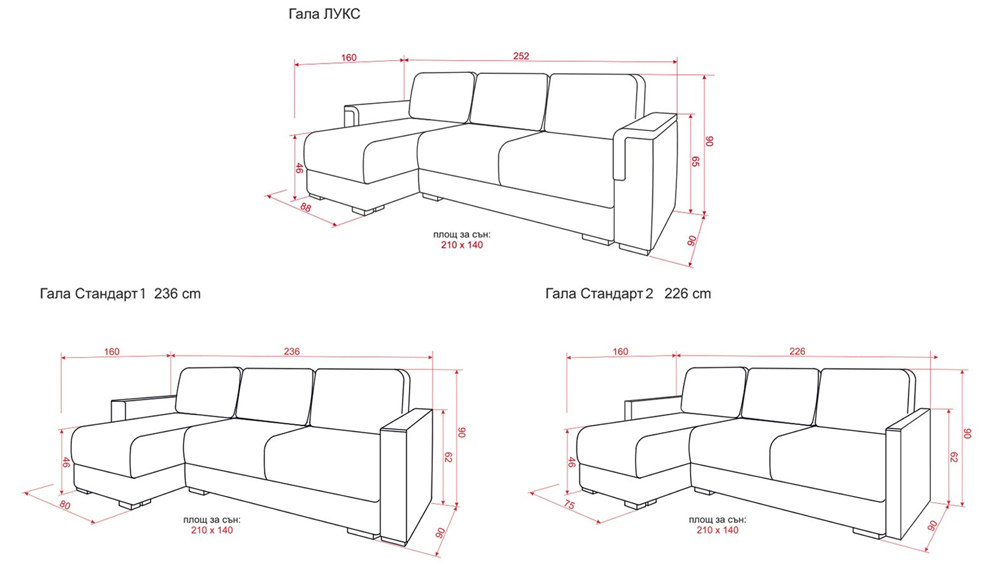 - Гала Стандарт 1: 236/160см, Спална площ: 210/140см