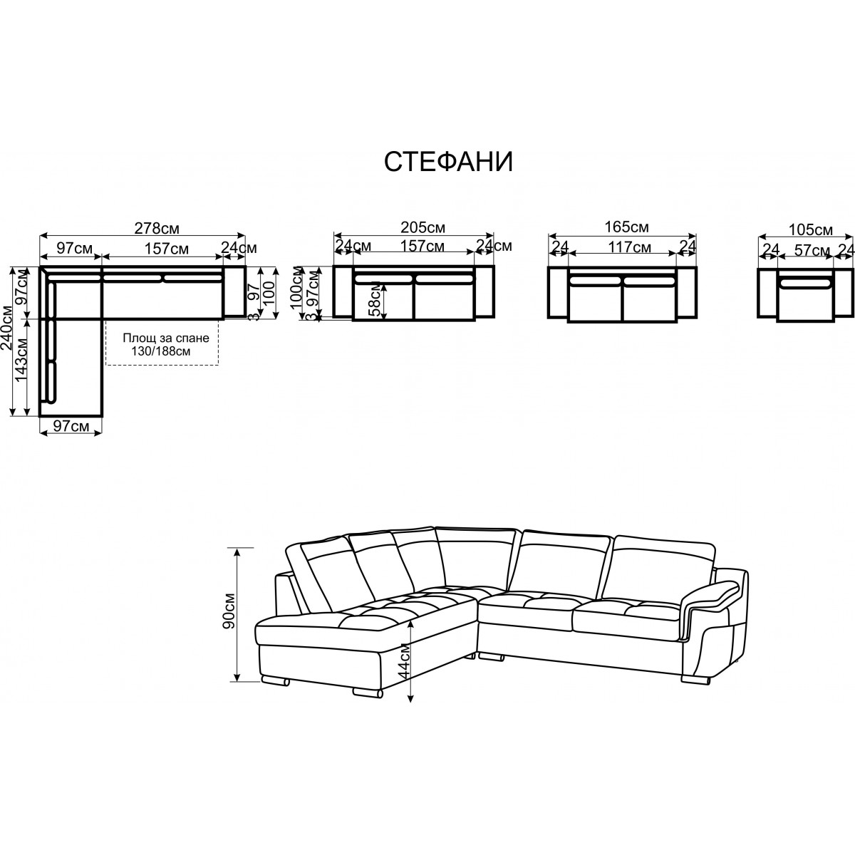 Диван Стефани – луксозна, модерна и стилна мека мебел. Седалните възглавници са от силиконов пух и високоеластична пяна, а в основата си има гъсто преплетени еластични колани за нужната здравина, гарантирана в годините. Облегалните възглавници са със свалящи се калъфи с цип и пълнеж от силиконов пух и формован високоеластичен дунапрен, захванат с цип за облегалката.