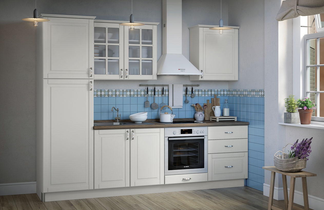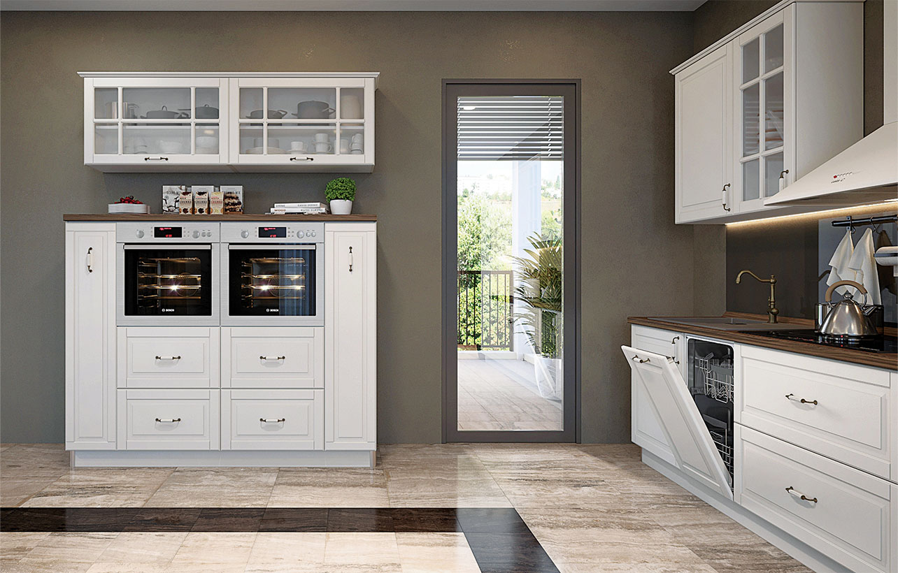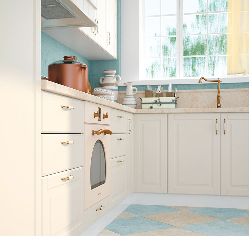 Кухня Evergreen е създадена в един от най-актуалните стилове – Винтидж и то в много приятен цвят – слонова кост. Фрезованите вратички и витрините, в съчетание с характерните за стила корнизи и ретро-дръжки, създават уют и приветливост. Чекмеджета са с механизми за плавно прибиране, панти с плавно затваряне. Дръжки в ретро стил. MDF покритие на лицето. Използвана е най-добрата технология за боядисване на фронта с нанасяне на UV мат-лаково покритие върху боядисана повърхност.