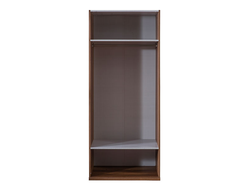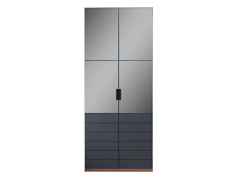 Двукрил гардероб от серията Zett, идеален за малки пространства. При комбиниране с още един двукрил или с трикрилия гардероб ZETT2MDF, той се вписва отлично и в по-големи стаи. Предлага се и в сив или бежов цвят. Изцяло изработен от MDF, с корпуси, ламинирани в дървесен декор, и матово бежови лакирани лица. Вътрешното пространство включва два рафта и лост за дрехи. Вратите са снабдени с панти с плавно затваряне, а горната им част има опушено огледало, което е практично и визуално разширява пространството. Металните дръжки са вкопани за по-изчистена визия.
