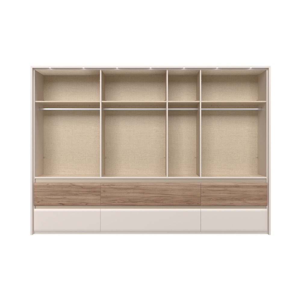 Вратите на гардероба са изцяло покрити с UV лак на водна основа с мек матов ефект в цвят кашмир с апликация от профилиран MDF в дървесен декор дъб тютюн