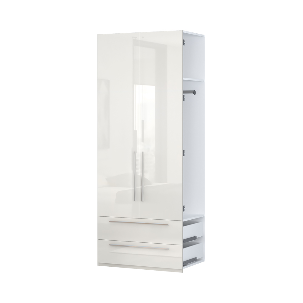 Функционален модулен гардероб с две врати и две чекмеджета с дизайнерска геометрична форма от колекция мебели PIANO. Този гардероб може да ви помогне да разширите избраната композиция на вашия гардероб с дължина на две врати.