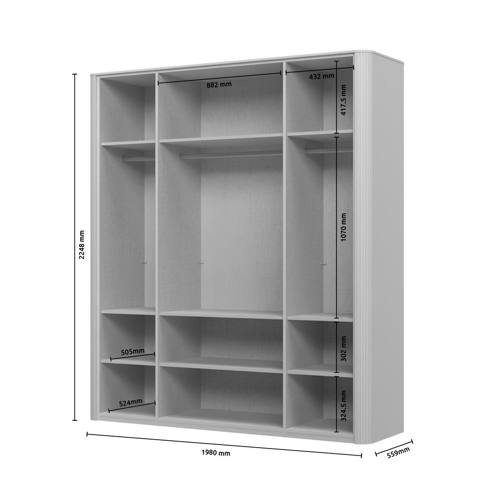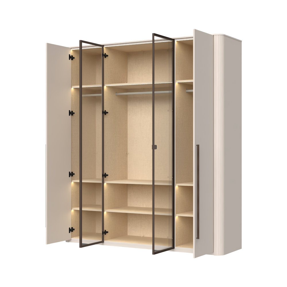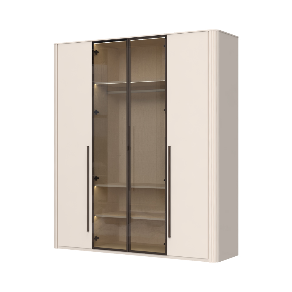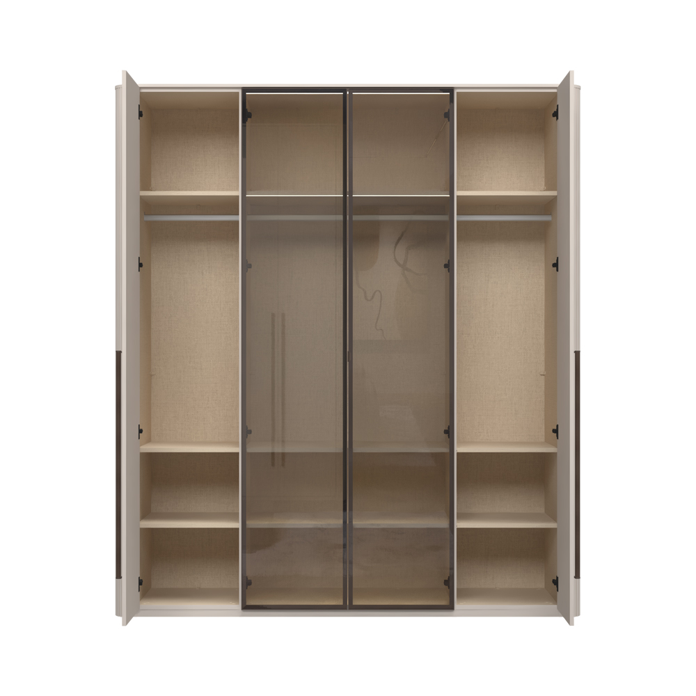 Гардероб с 4 врати : 2 покрити с мек матов UV лак в цвят кашмир и 2 стъкло парсол с алуминиева рамка.