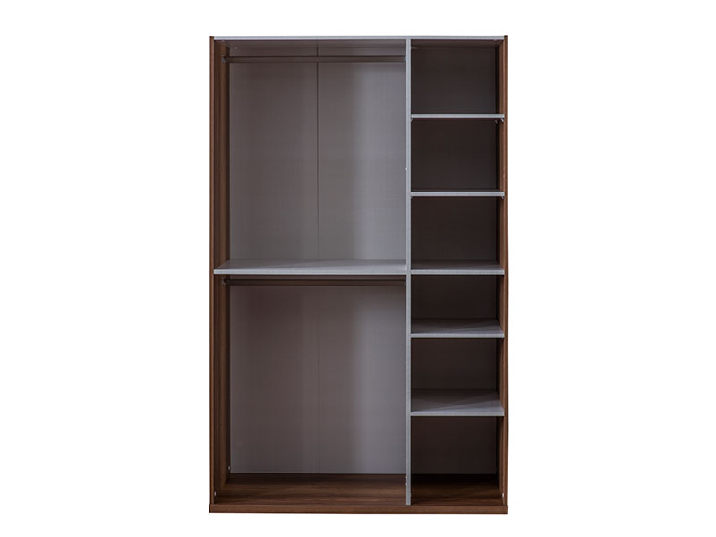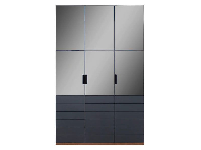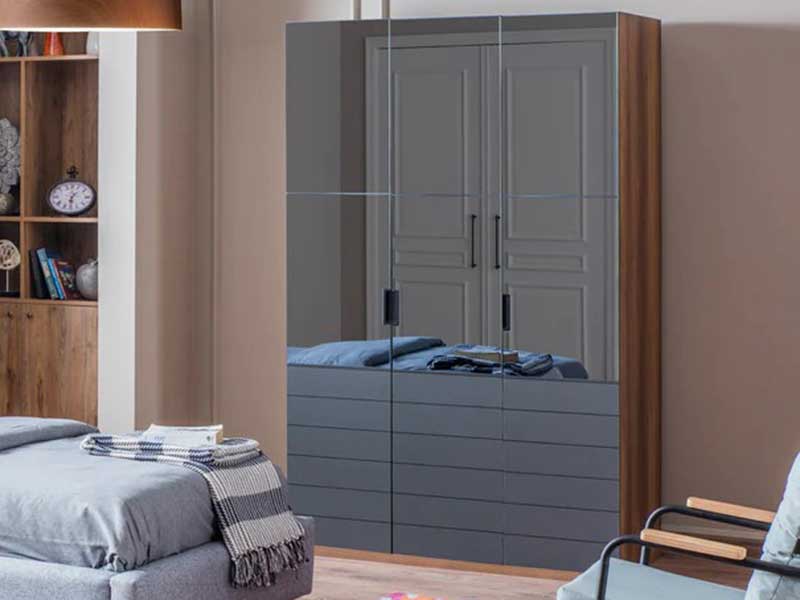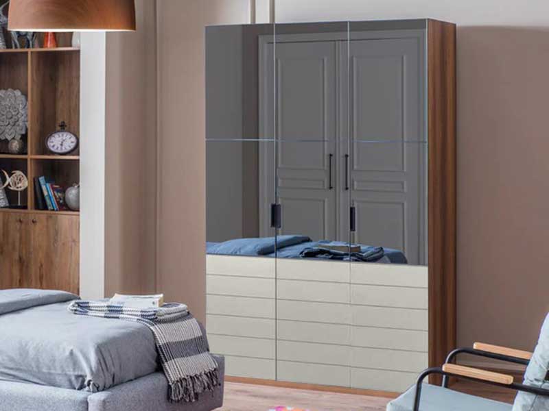 Модерен трикрил гардероб с врати отварящи са на панти. Гардеробът е изработен изцяло от MDF, като вратите са боядисани в бежов цвят а корпусът е покрит с ламинирано декоративно покритие в цвят орех. В горната част на вратите има поставени огледала със сив отенък, а долната бежова част е с характерните за модела хоризонтални вкопани декоратини канали. Дръжките са метални и са вкопани в канта на лицата. Вътрешното разпределение е пълноценно, като в лявата част (зад средната и лавата врата) има широко пространство с два рафта и два лоста за дрехи, а зад дясната врата има пет рфта. Гардеробът се предлага и във вариант със сив цвят на лицето.