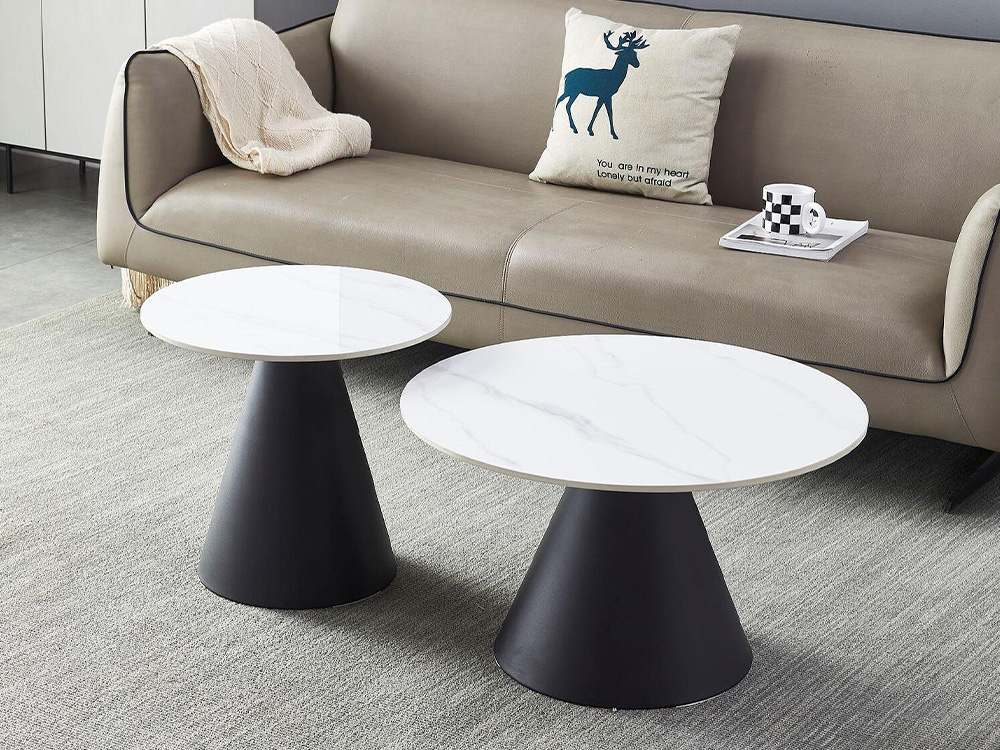 Холни маси “Nora” са комплект, който се състои от две кръгли маси – голяма и малка. Плотовете са изработени от синтерован камък с визия бял мрамор, а основите им са метални.
