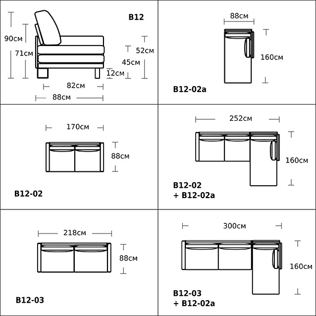 Със здрава конструкция и изключителен комфорт, разтегателният Б12 има вграден разтегателен механизъм от най-високо качество и лесно се превръща в удобно легло. Със своята значителна дълбочина и подвижни възглавници на гърба, Б12 е достатъчно голям, за да се спи на него и без да се разтяга. Tова е холов ъгъл от модулна система Б12, която може да видите в приложената схема. За повече информация, моля, обърнете се към нашите консултанти.