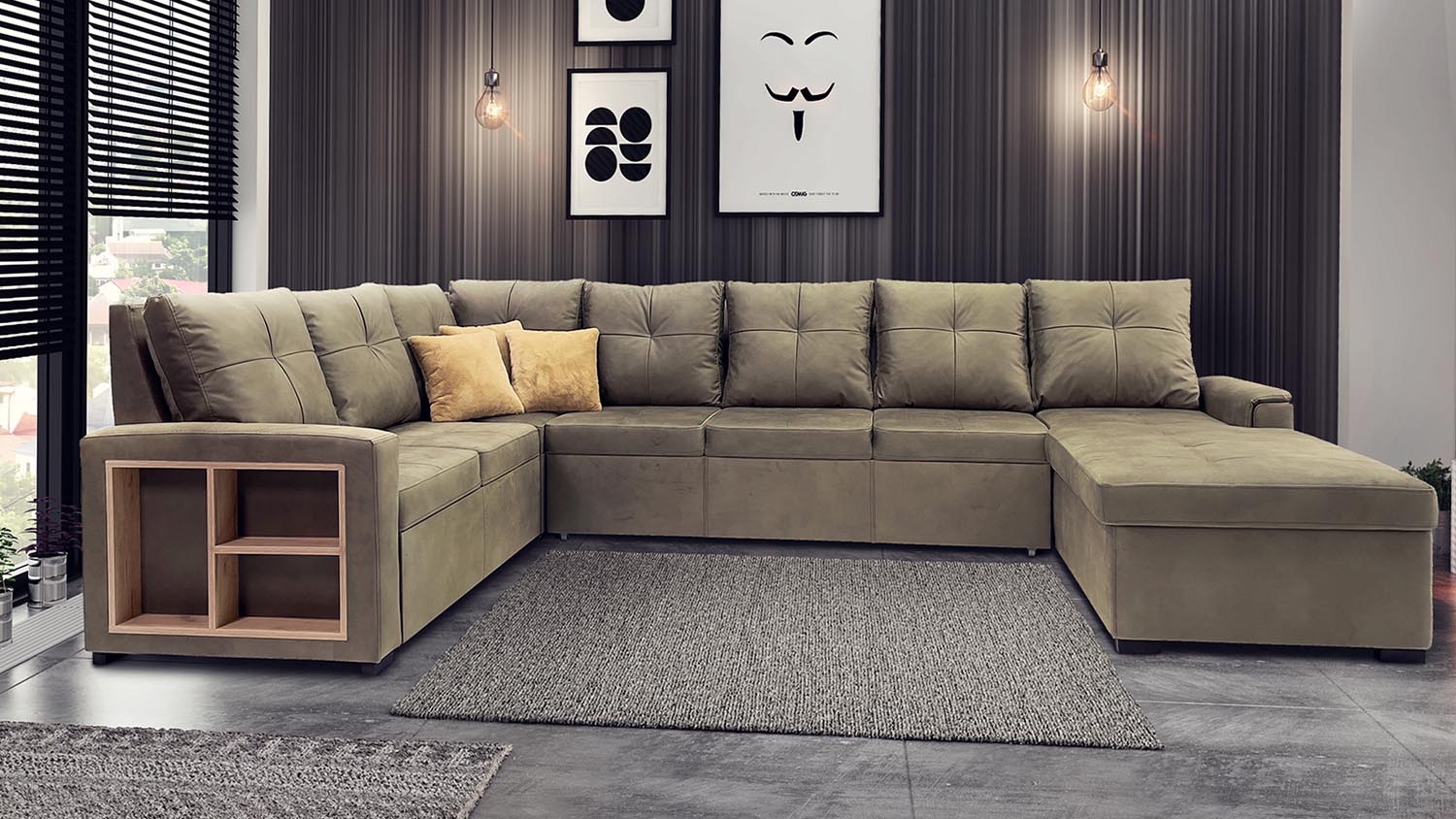 Холовият ъгъл е много комфортен, с извита и висока облегалка. Облегалните възглавници са пълни със силиконов пух. Седалката е изработена от зигзагообразни стоманени арматури, които придават удобство при сядане и изключват хлътване на дивана. Височината на седалната част го прави удобен и за използване в трапезария, като трапезен ъгъл. Механизмът за сън е от типа “Подматрак”, който се отваря съвсем лесно с изтегляне и се образува удобно и широко легло.
