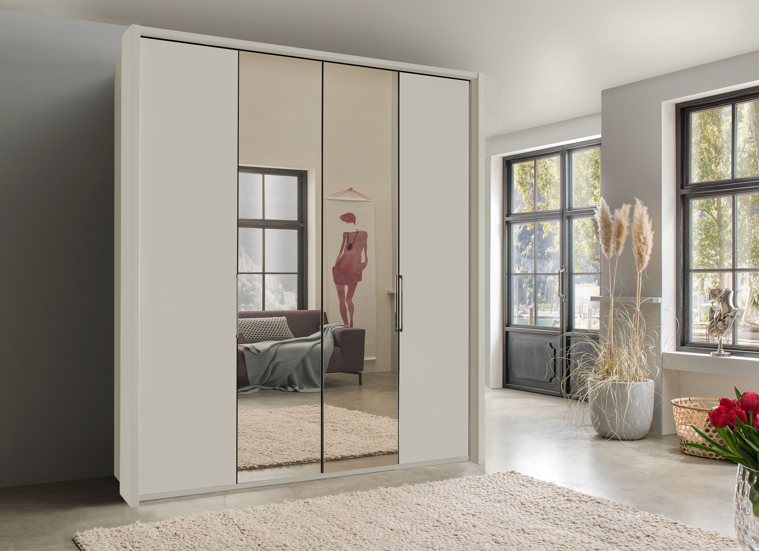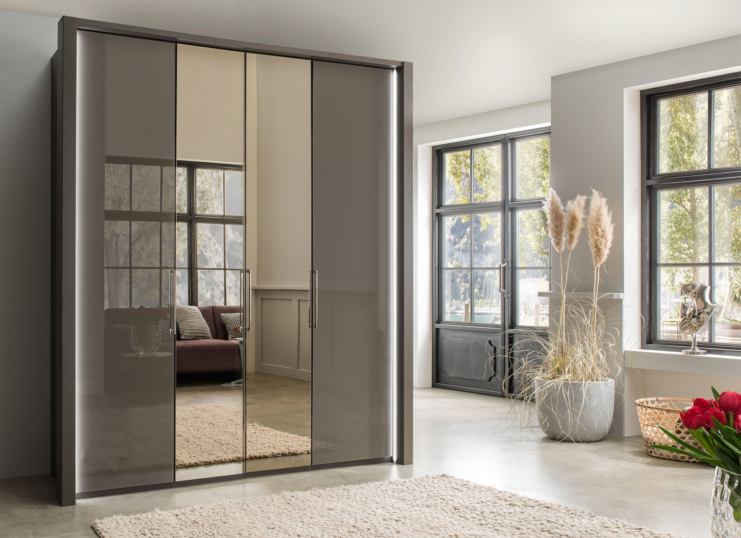 – Гардеробите и допълнителните шкафове имат фронтове в същия цвят като корпуса или стъклени фронтове, като и двете могат да се комбинират по избор с кристални огледални врати