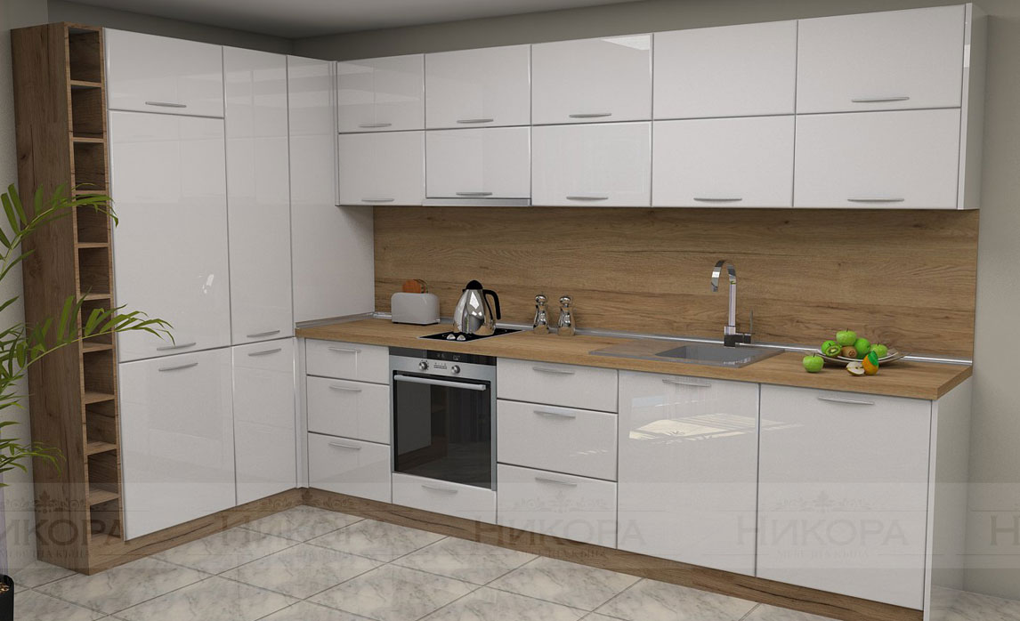 Това е проект за кухня изработена от проектантите на Мебелна къща „Никора“. Тя е с корпус от ПДЧ и лице от МДФ гланц. Кухните с лице от МДФ гланц са среден клас мебели – както като качество, така и ценово. Могат да бъдат поръчани с по-евтин или с по-скъп обков – панти, дръжки, механизми. Има възможност за избор на цветове за лице, корпус, а също и термоустойчив плот и термоустойчив гръб.