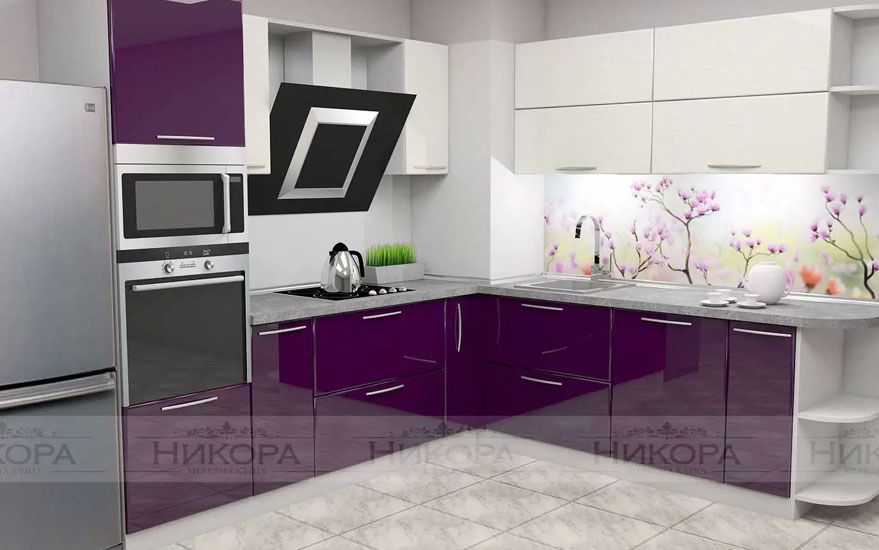 Това е проект за кухня изработена от проектантите на Мебелна къща „Никора“. Тя е с корпус от ПДЧ и лице от МДФ гланц. Кухните с лице от МДФ гланц са среден клас мебели – както като качество, така и ценово. Могат да бъдат поръчани с по-евтин или с по-скъп обков – панти, дръжки, механизми. Има възможност за избор на цветове за лице, корпус, а също и термоустойчив плот и термоустойчив гръб.