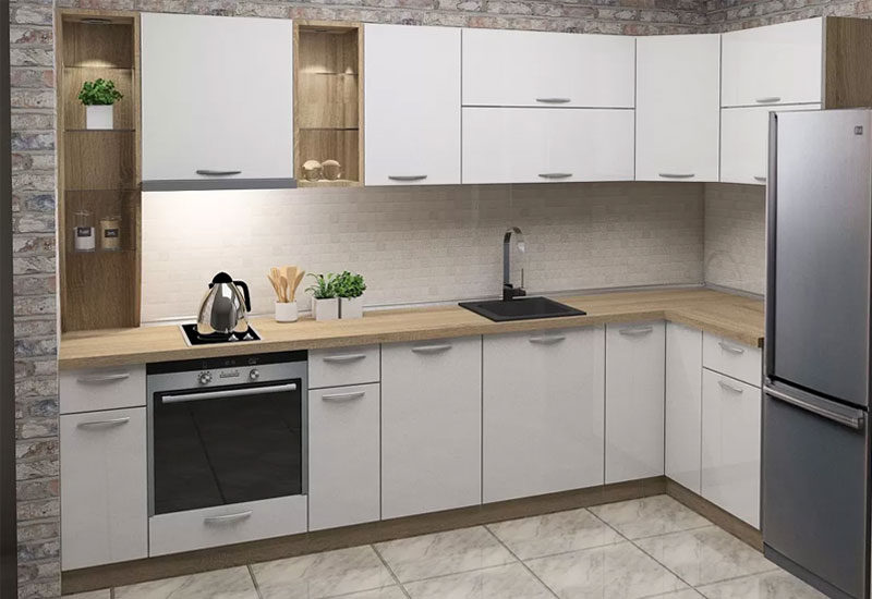 Това е проект за кухня изработена от проектантите на Мебелна къща „Никора“. Тя е с корпус от ПДЧ и лице от МДФ гланц. Кухните с лице от МДФ гланц са среден клас мебели – както като качество, така и ценово. Могат да бъдат поръчани с по-евтин или с по-скъп обков – панти, дръжки, механизми. Има възможност за избор на цветове за лице, корпус, а също и термоустойчив плот и термоустойчив гръб. Ние предлагаме и много актуалният вариант за гръб от принт стъкло в многобройни и ефектни картини.