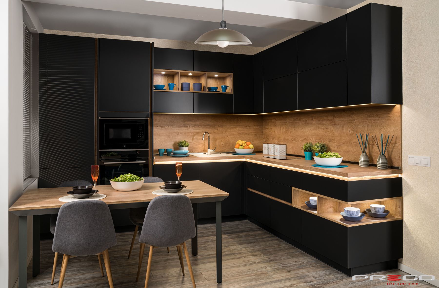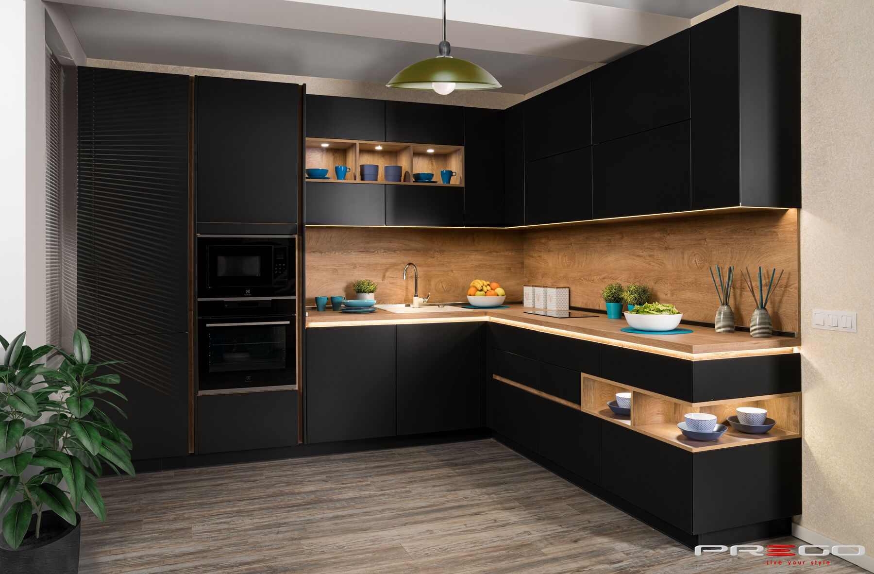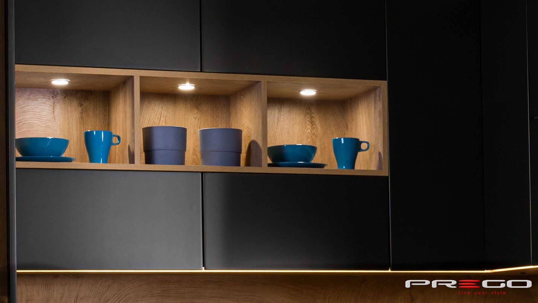 СКРИТО ОСВЕТЛЕНИЕ- Добавили сме меко LED осветление скрито под плота и зад вратичките на горния ред. Това променя общият изглед на кухнята и допринася за романтична атмосфера. За да имате ефектна кухня сме проектирали отворени етажерки с осветление. В тях може да сложите декорации и да впечатлите със собствен стил.