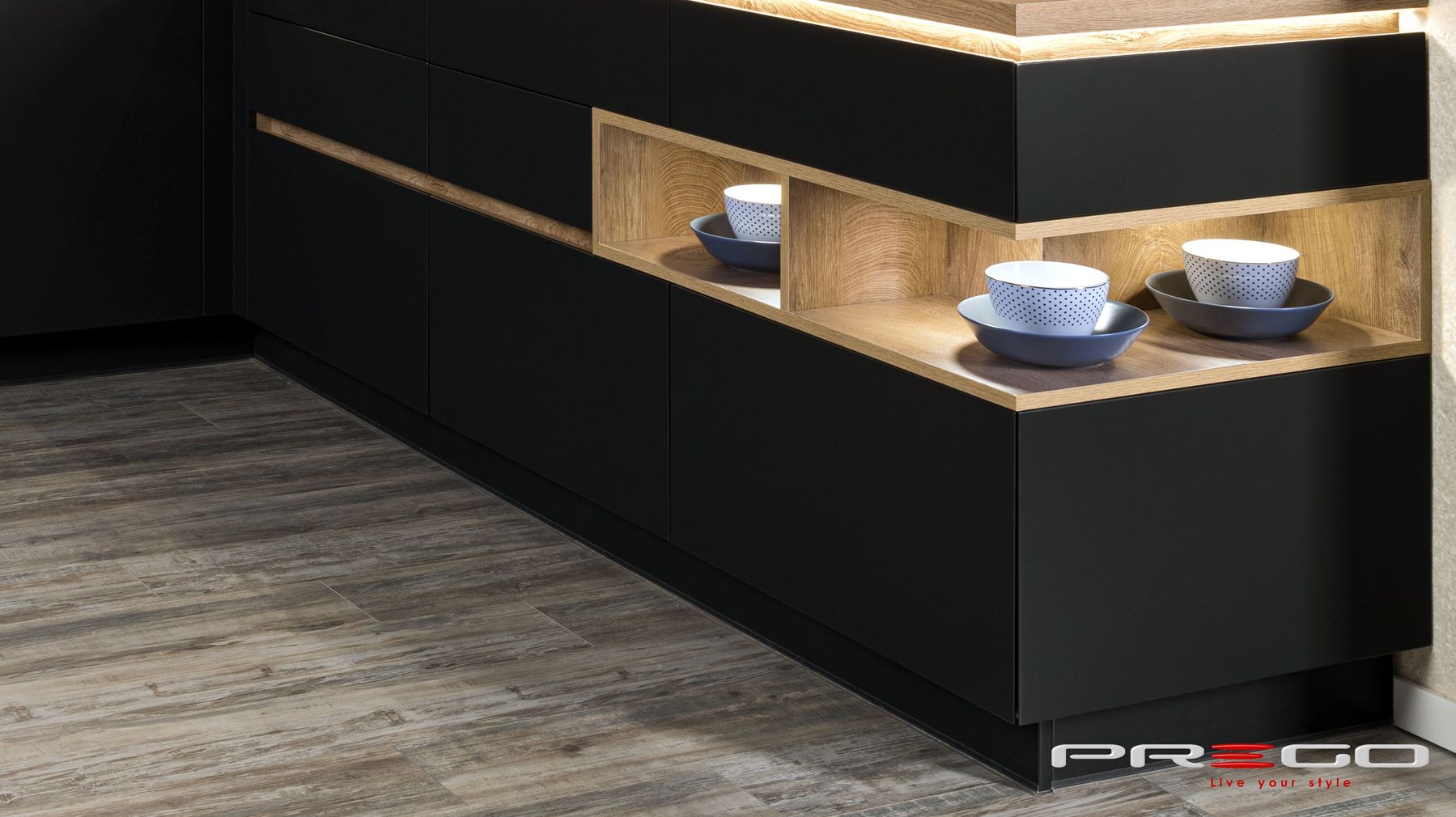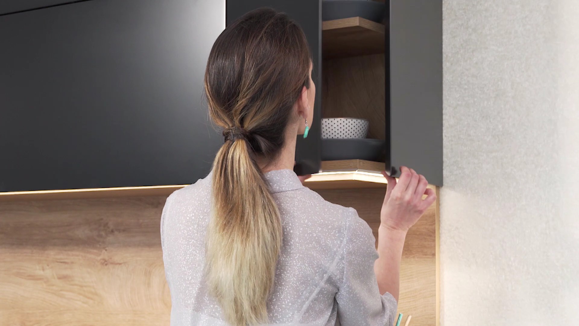 Кухня без видими дръжки. Линията на дръжката дава възможност да се разкрие ефектът на прекрасния дървесен декор, като важен елемент от индивидуалността на Хера. Това може да стане както по цялата дължината на кухнята, така и по височината.