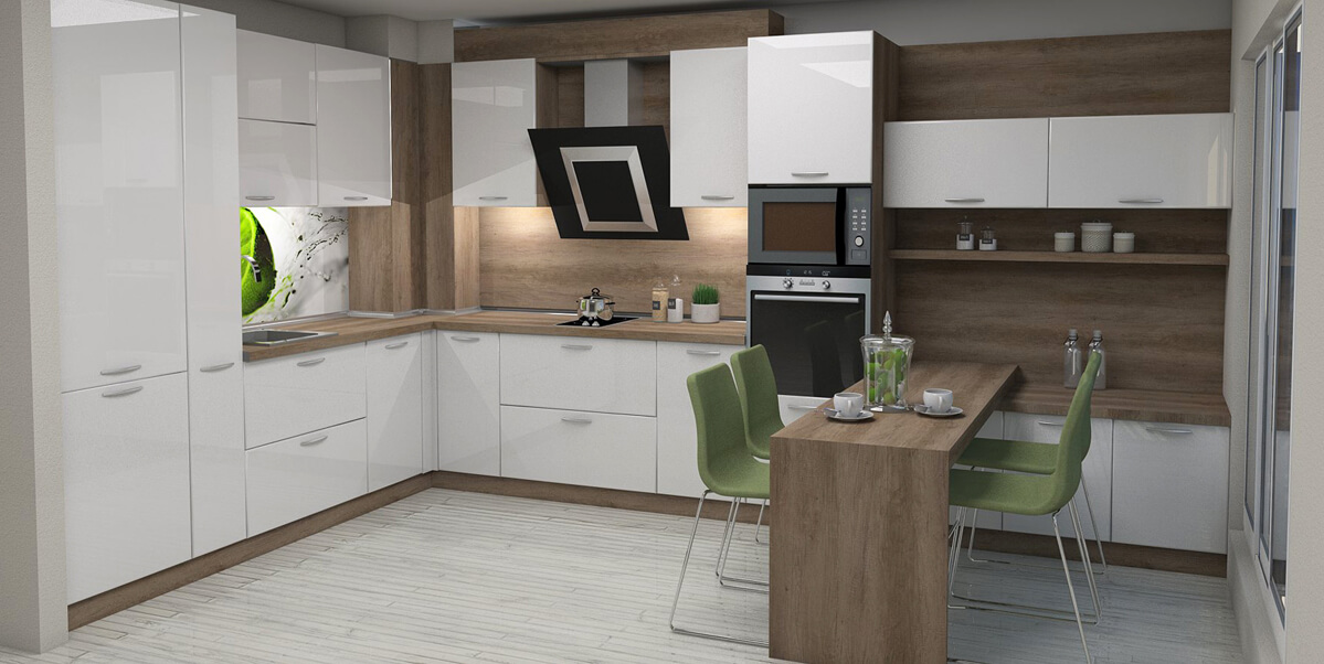 Това е проект за кухня изработена от проектантите на Мебелна къща „Никора“. Тя е с корпус от ПДЧ и лице от МДФ гланц. Кухните с лице от МДФ гланц са среден клас мебели – както като качество, така и ценово. Могат да бъдат поръчани с по-евтин или с по-скъп обков – панти, дръжки, механизми. Има възможност за избор на цветове за лице, корпус, а също и термоустойчив плот и термоустойчив гръб. Ние предлагаме и много актуалният вариант за гръб от принт стъкло в многобройни и ефектни картини.