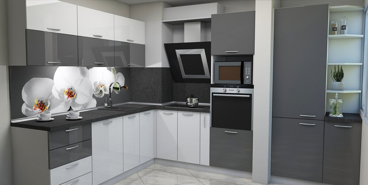 Това е проект за кухня изработена от проектантите на Мебелна къща „Никора“. Тя е с корпус от ПДЧ и лице от МДФ гланц. Кухните с лице от МДФ гланц са среден клас мебели – както като качество, така и ценово. Могат да бъдат поръчани с по-евтин или с по-скъп обков – панти, дръжки, механизми. Има възможност за избор на цветове за лице, корпус, а също и термоустойчив плот и термоустойчив гръб. Ние предлагаме и много актуалният вариант за гръб от принт стъкло в многобройни и ефектни картини.