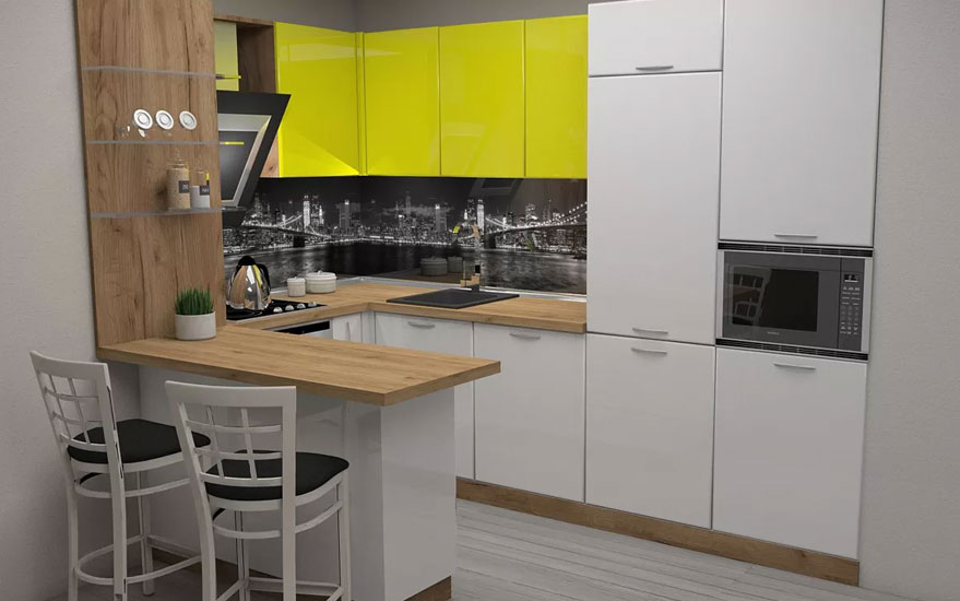 Това е проект за кухня изработена от проектантите на Мебелна къща „Никора“. Тя е с корпус от ПДЧ и лице от МДФ гланц. Кухните с лице от МДФ гланц са среден клас мебели – както като качество, така и ценово. Могат да бъдат поръчани с по-евтин или с по-скъп обков – панти, дръжки, механизми. Има възможност за избор на цветове за лице, корпус, а също и термоустойчив плот и термоустойчив гръб. Ние предлагаме и много актуалният вариант за гръб от принт стъкло в многобройни и ефектни картини.