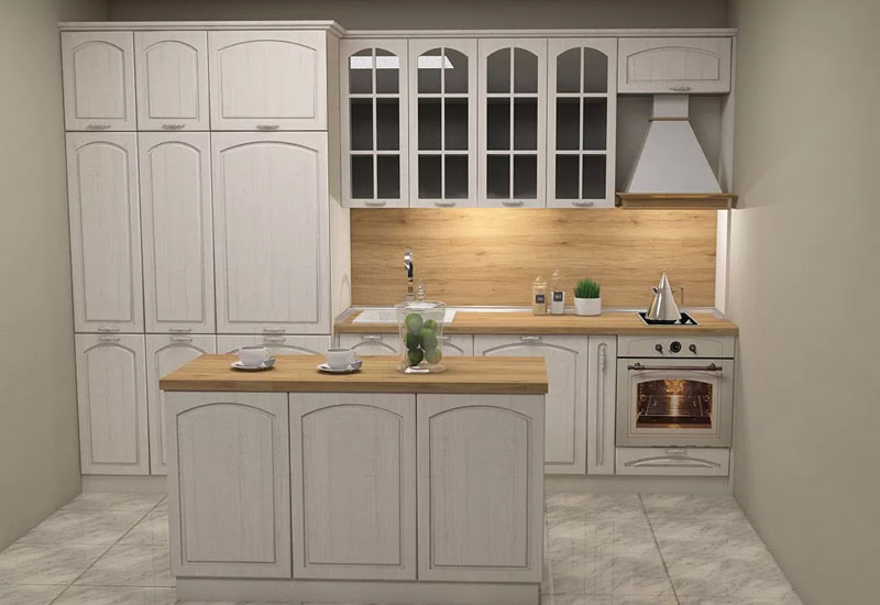 Това е проект за кухня изработена от проектантите на Мебелна къща „Никора“. Тя е с корпус от ПДЧ и лице от пресован МДФ. Кухните с лице от пресован МДФ са среден клас мебели – както като качество, така и ценово. Могат да бъдат поръчани с по-евтин или с по-скъп обков – панти, дръжки, механизми. Има възможност за избор на цветове за лице, корпус, а също и термоустойчив плот и термоустойчив гръб.