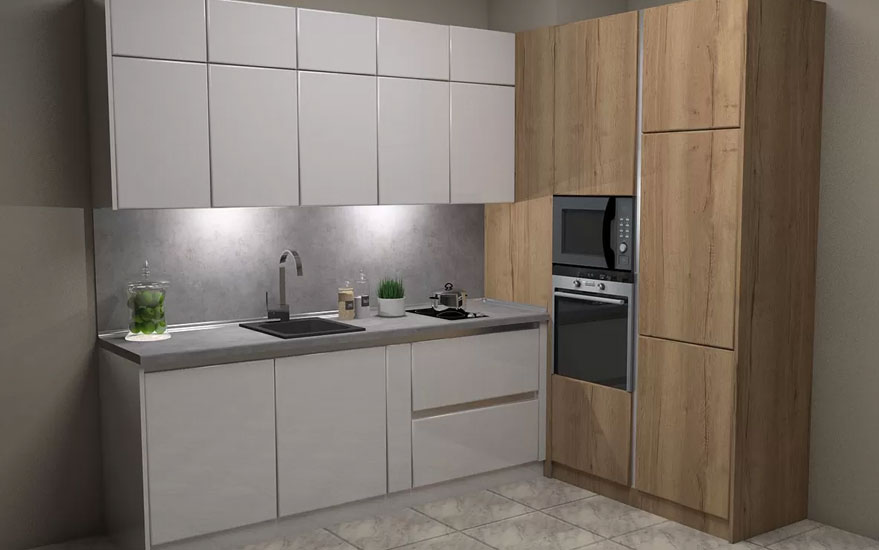 Това е проект за кухня изработена от проектантите на Мебелна къща „Никора“. Тя е с корпус от ПДЧ и лице от МДФ гланц. Кухните с лице от МДФ гланц са среден клас мебели – както като качество, така и ценово. Могат да бъдат поръчани с по-евтин или с по-скъп обков – панти, дръжки, механизми. Има възможност за избор на цветове за лице, корпус, а също и термоустойчив плот и термоустойчив гръб.