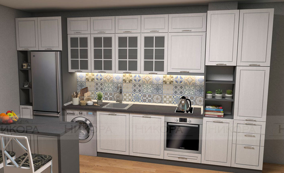 Това е проект за кухня изработена от проектантите на Мебелна къща „Никора“. Тя е с корпус от ПДЧ и лице от МДФ гланц. Кухните с лице от МДФ гланц са среден клас мебели – както като качество, така и ценово. Могат да бъдат поръчани с по-евтин или с по-скъп обков – панти, дръжки, механизми. Има възможност за избор на цветове за лице, корпус, а също и термоустойчив плот и термоустойчив гръб.