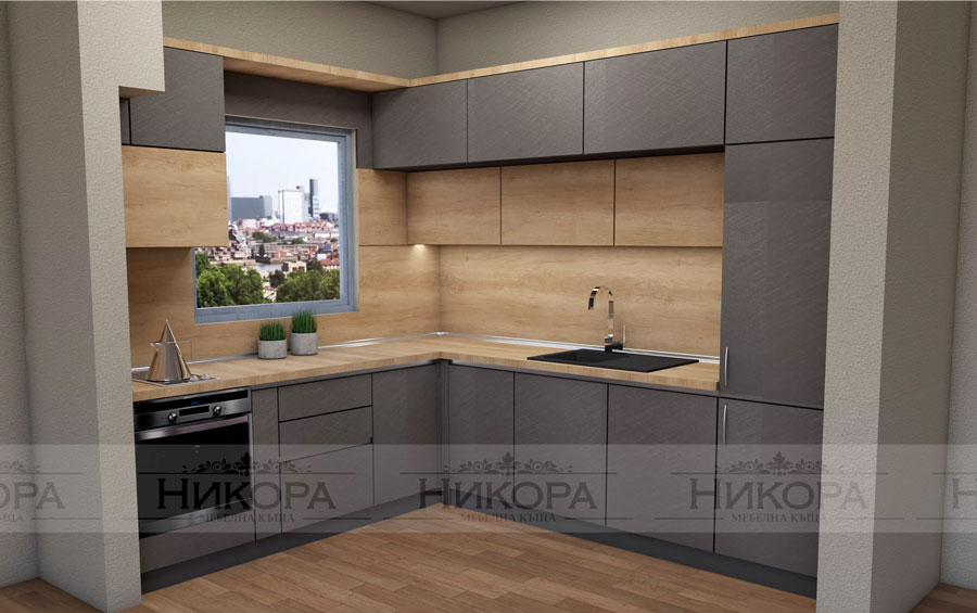 Това е проект за кухня изработена от проектантите на Мебелна къща „Никора“. Тя е с корпус от ПДЧ и лице от МДФ гланц. Кухните с лице от МДФ гланц са среден клас мебели – както като качество, така и ценово. Могат да бъдат поръчани с по-евтин или с по-скъп обков – панти, дръжки, механизми. Има възможност за избор на цветове за лице, корпус, а също и термоустойчив плот и термоустойчив гръб.