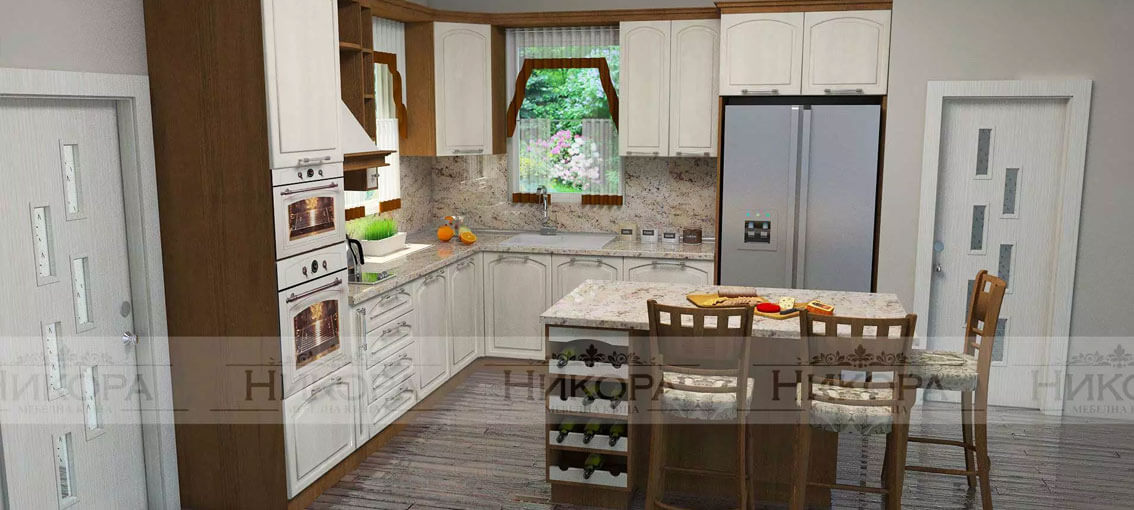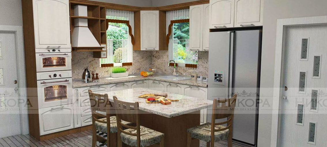 Това е проект за кухня изработена от проектантите на Мебелна къща „Никора“. Тя е с корпус от ПДЧ и лице от МДФ гланц. Кухните с лице от МДФ гланц са среден клас мебели – както като качество, така и ценово. Могат да бъдат поръчани с по-евтин или с по-скъп обков – панти, дръжки, механизми. Има възможност за избор на цветове за лице, корпус, а също и термоустойчив плот и термоустойчив гръб.