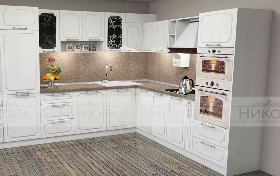 Това е проект за кухня изработена от проектантите на Мебелна къща „Никора“. Тя е с корпус от ПДЧ и лице от МДФ гланц. Кухните с лице от МДФ гланц са среден клас мебели – както като качество, така и ценово. Могат да бъдат поръчани с по-евтин или с по-скъп обков – панти, дръжки, механизми. Има възможност за избор на цветове за лице, корпус, а също и термоустойчив плот и термоустойчив гръб.