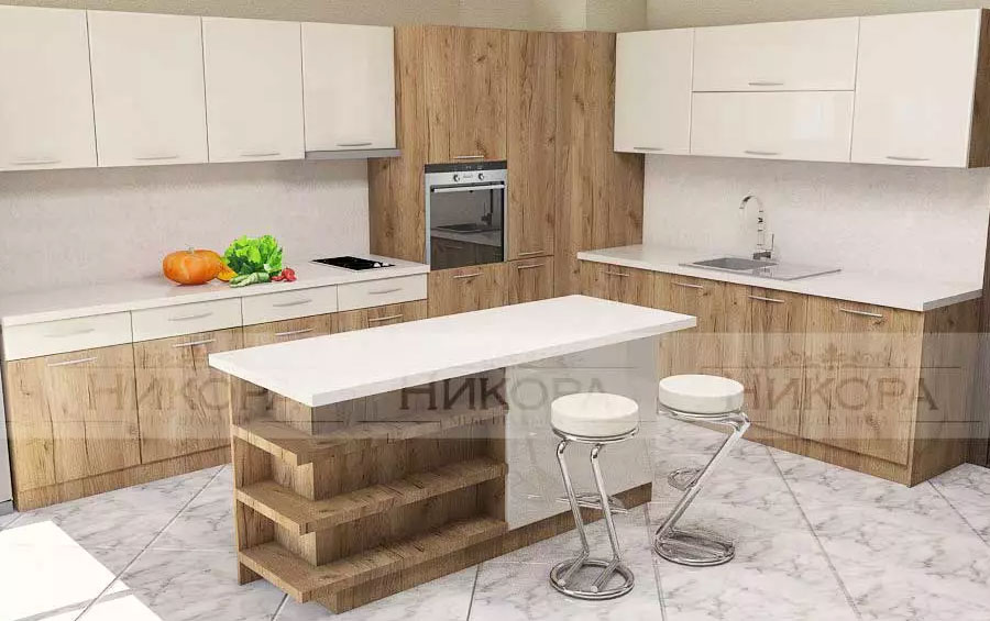 Това е проект за кухня изработена от проектантите на Мебелна къща „Никора“. Тя е с корпус от ПДЧ и лице от МДФ гланц. Кухните с лице от МДФ гланц са среден клас мебели – както като качество, така и ценово. Могат да бъдат поръчани с по-евтин или с по-скъп обков – панти, дръжки, механизми. Има възможност за избор на цветове за лице, корпус, а също и термоустойчив плот и термоустойчив гръб.