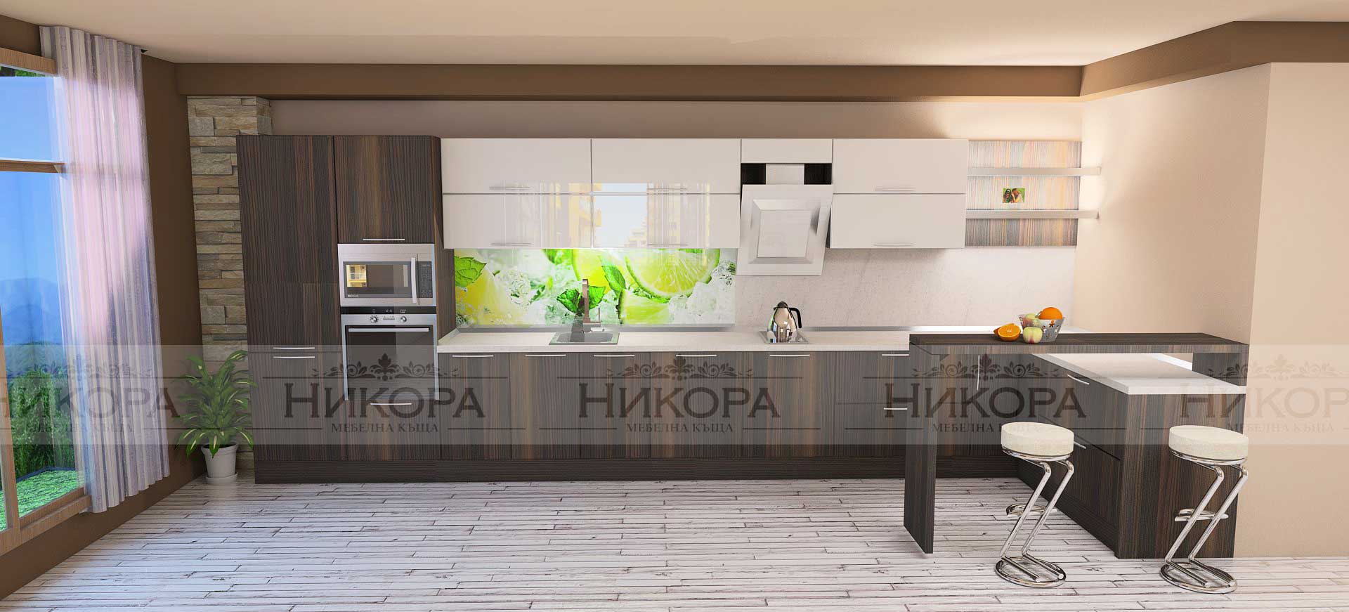Това е проект за кухня изработена от проектантите на Мебелна къща „Никора“. Тя е с корпус от ПДЧ и лице от МДФ гланц. Кухните с лице от МДФ гланц са среден клас мебели – както като качество, така и ценово. Могат да бъдат поръчани с по-евтин или с по-скъп обков – панти, дръжки, механизми. Има възможност за избор на цветове за лице, корпус, а също и термоустойчив плот и термоустойчив гръб.