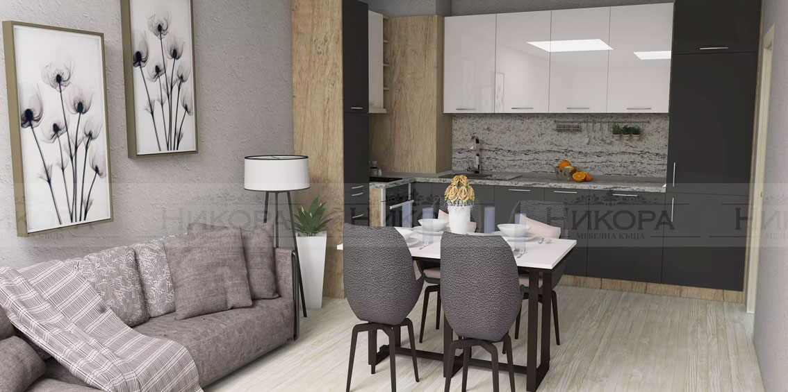 Това е проект за кухня изработена от проектантите на Мебелна къща „Никора“. Тя е с корпус от ПДЧ и лице от МДФ гланц. Кухните с лице от МДФ гланц са среден клас мебели – както като качество, така и ценово. Могат да бъдат поръчани с по-евтин или с по-скъп обков – панти, дръжки, механизми. Има възможност за избор на цветове за лице, корпус, а също и термоустойчив плот и термоустойчив гръб.