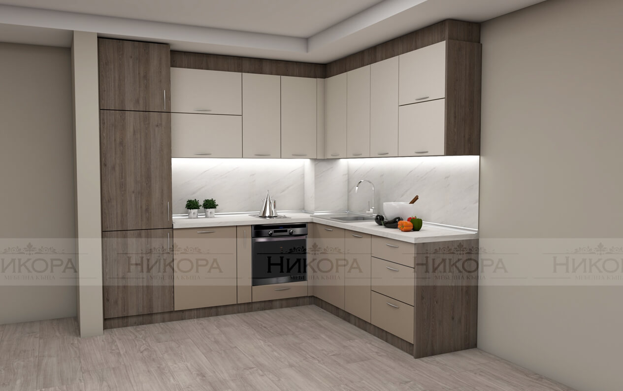 Това е проект за кухня изработена от проектантите на Мебелна къща „Никора“. Тя е с корпус от ПДЧ и лице от МДФ гланц. Кухните с лице от МДФ гланц са среден клас мебели – както като качество, така и ценово. Могат да бъдат поръчани с по-евтин или с по-скъп обков – панти, дръжки, механизми. Има възможност за избор на цветове за лице, корпус, а също и термоустойчив плот и термоустойчив гръб.